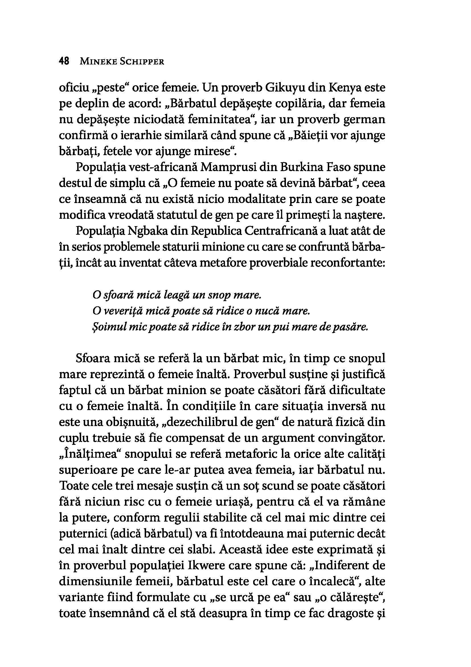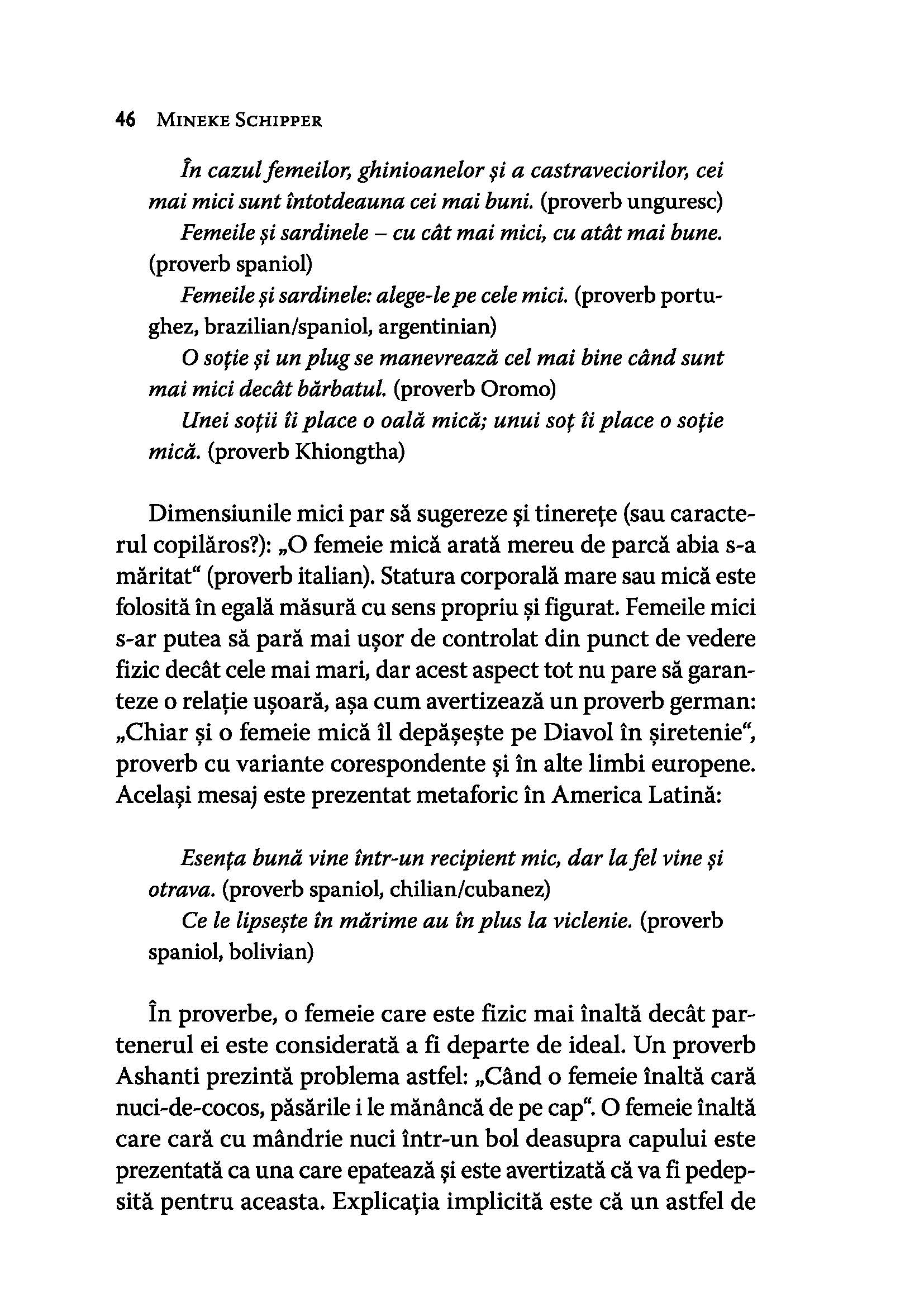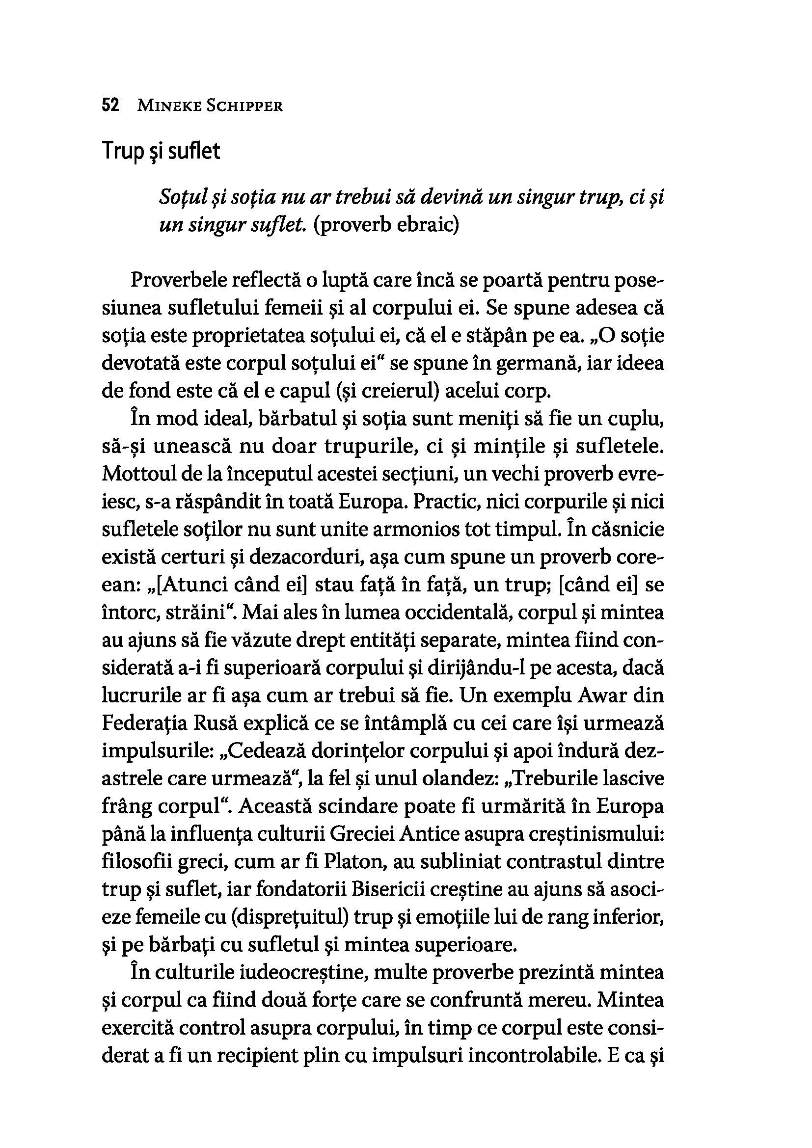 În toate culturile, sexul și genul și-au găsit expresia în cel mai concis gen literar, și anume în proverbe. Acestea oferă perspective revelatoare asupra condiției femeii de-a lungul secolelor și al continentelor, iar, în mod surprinzător, asemănările dintre miile de proverbe despre femei sunt mai numeroase decât diferențele.