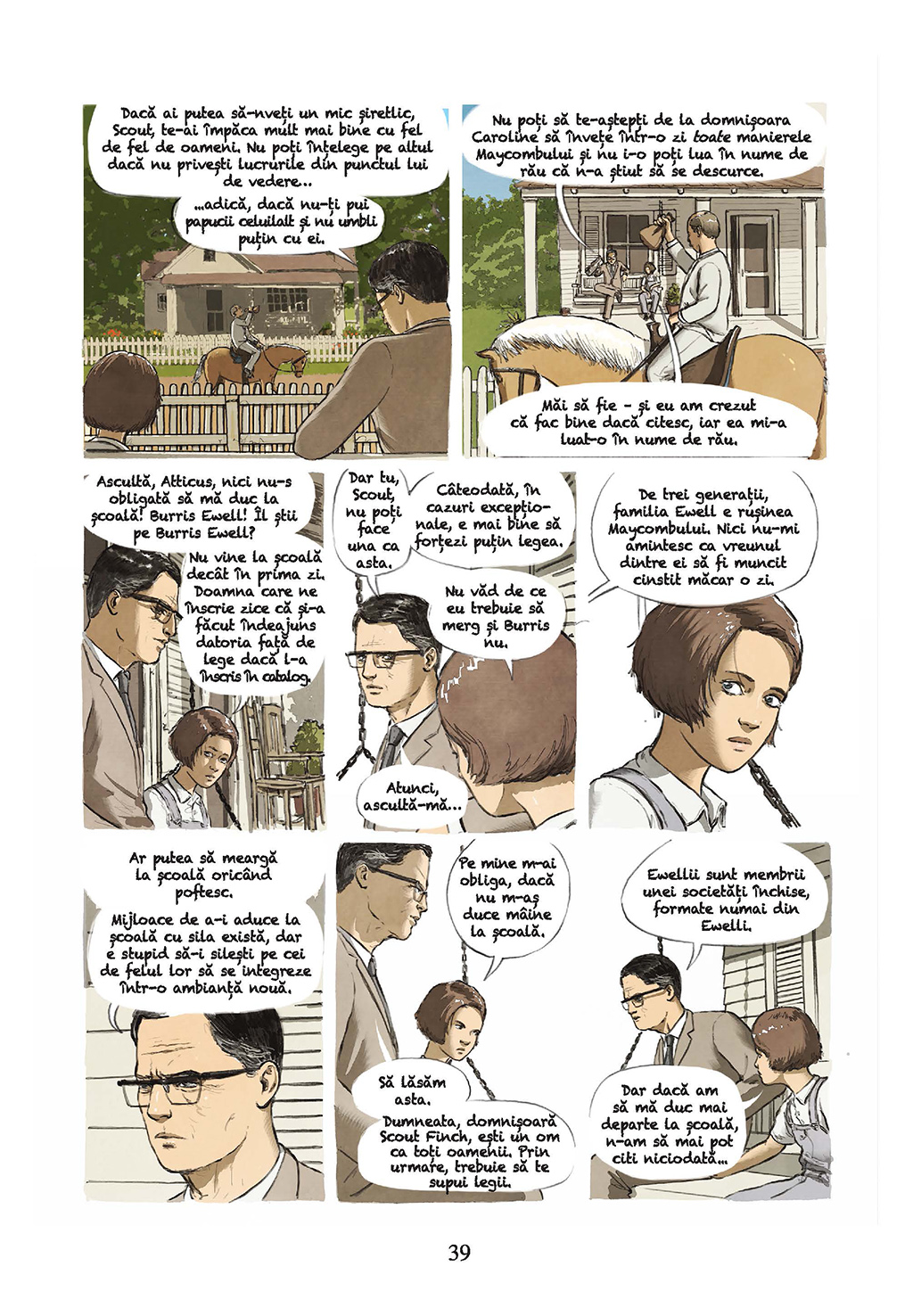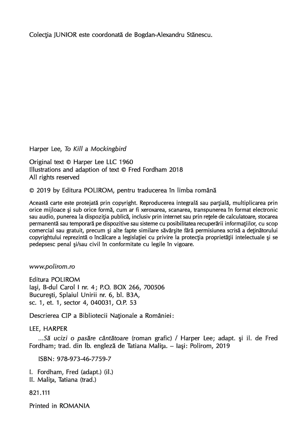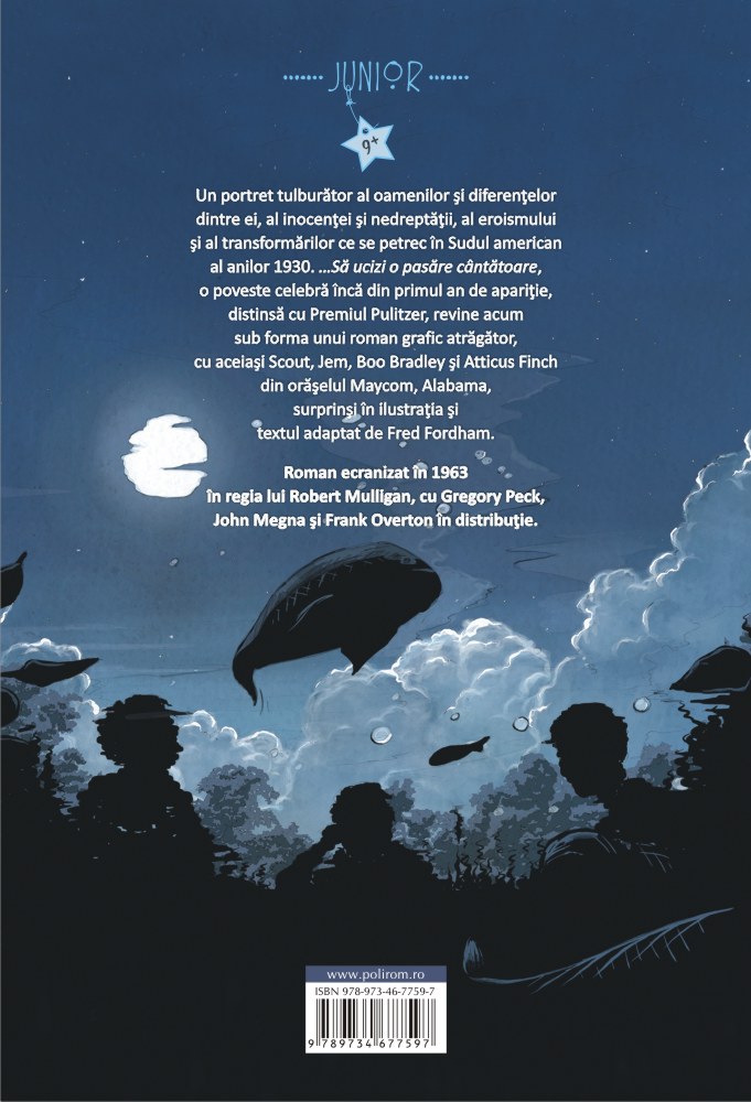 Un portret tulburător al oamenilor şi diferenţelor dintre ei, al inocenţei şi nedreptăţii, al eroismului şi al transformărilor ce se petrec în Sudul american al anilor 1930. …Să ucizi o pasăre cântătoare, o poveste celebră încă din primul an de apariţie, distinsă cu Premiul Pulitzer, revine acum sub forma unui roman grafic atrăgător, cu aceiaşi Scout, Jem, Boo Bradley şi Atticus Finch din orăşelul Maycom, Alabama, surprinşi în ilustraţia şi textul adaptat de Fred Fordham.