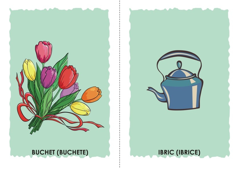 SĂ VORBIM CORECT! conţine jetoane cu ajutorul cărora copiii pot forma perechi între imagini (feminin-masculin: fată-băiat, oaie-berbec etc.). Se observă că unele imagini nu au pereche, ceea ce înseamnă că denumirea lor are o singură formă (girafă, furnică, elefant, fluture). O altă variantă de joc este “Eu spun una, tu spui multe” - un adult va denumi fiecare imagine de pe jetoane (fată, găină, pălărie, elefant, fluture, ac, măr etc.), iar copiii vor spune mai multe (fete, găini, pălării, ananaşi, struguri, furtunuri, treninguri etc.). Ei vor observa că unele denumiri sunt la fel şi la singular şi la plural (educatoare, arici, pui, ochelari, pantaloni). Astfel, prin joc, copiii vor învăţa cuvinte noi, pe care le vor utiliza în contexte adecvate. Format: 10x15 cm, carton 250 g/mp, 40 jetoane.