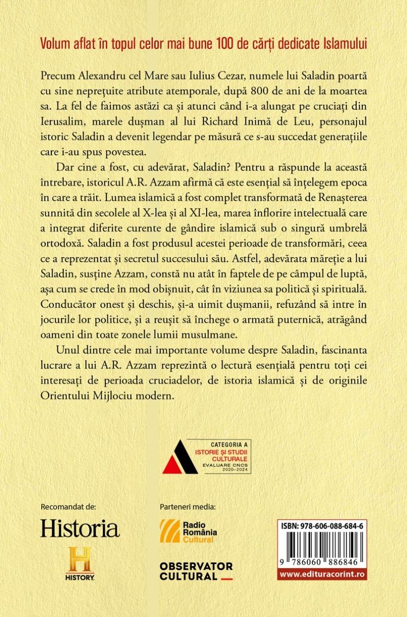 Cea mai importantă biografie a lui Saladin apărută în ultimele două decenii, fascinanta lucrare a lui A.R. Azzam reprezintă o lectură esențială pentru toți cei interesați de perioada cruciadelor, de istoria islamică și de originile Orientului Mijlociu modern.