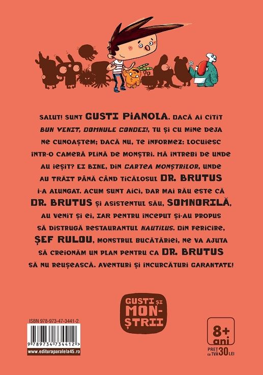 Salut! Sunt GUSTI Pianola. Dacă ai citit BUN VENIT, DOMNULE CONDEI!, tu și cu mine deja ne cunoaștem; dacă nu, te informez: locuiesc într-o cameră plină de monștri. Mă întrebi de unde au ieșit? EI BINE, din Cartea monștrilor, unde AU TRĂIT până când ticălosul Dr. BRUTUS i-a alungat. acum sunt aici, dar mai rău este că Dr. BRUTUS și asistentul său, SOMNORILĂ, au venit și ei, IAR pentru început și-au propus să distrugă restaurantul Nautilus. Din fericire, ȘEF RULOU, monstrul bucătăriei, ne va ajuta să creionăm un plan pentru ca Dr. BRUTUS să nu reușească. Aventuri și încurcături GARANTATE!