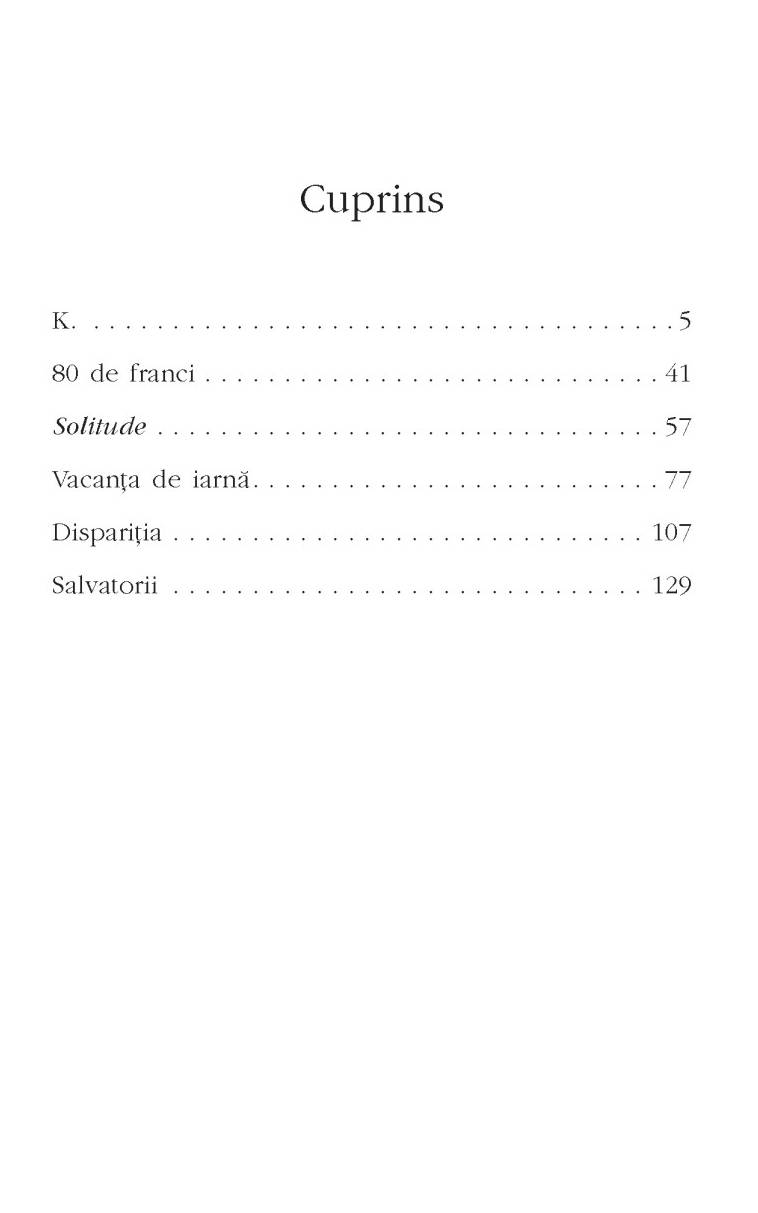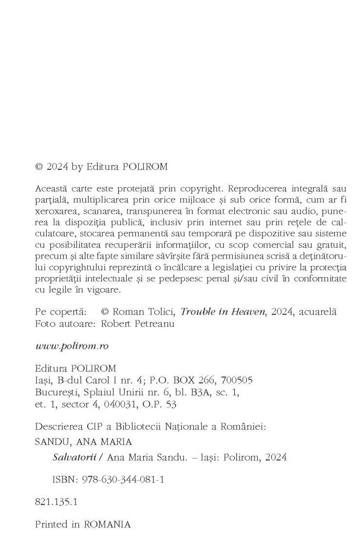 În cartea Salvatorii regăsim șase povestiri despre cupluri, iluzii și dorința de a fi iubiți. Un amor online, o pisică bătrână care e ultimul bun comun al unor oameni ce s-au despărțit, o femeie care muncește în Italia, o vacanță de iarnă compensatorie, o asemănare neliniștitoare, un necunoscut fără adăpost care tulbură, într-o seară ploioasă, viața unor bucureșteni.