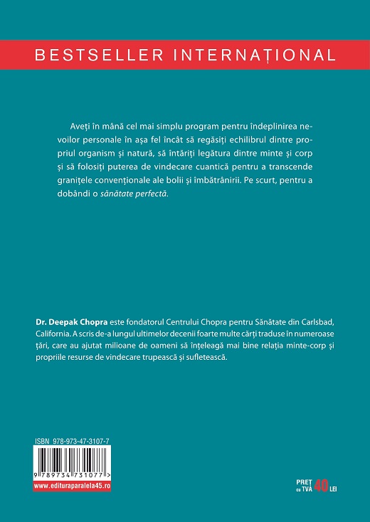 Aveți în mână cel mai simplu program pentru îndeplinirea nevoilor personale în așa fel încât să regăsiți echilibrul dintre propriul organism și natură, să întăriți legătura dintre minte și corp și să folosiți puterea de vindecare cuantică pentru a transcende granițele convenționale ale bolii și îmbătrânirii. Pe scurt, pentru a dobândi o sănătate perfectă.