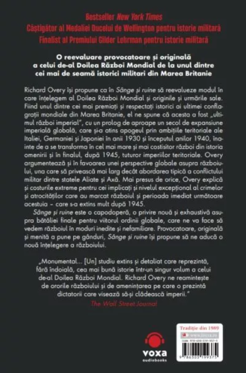 Richard Overy își propune ca în Sânge și ruine să reevalueze modul în care înțelegem al Doilea Război Mondial și originile și urmările sale. Fiind unul dintre cei mai premiați și respectați istorici ai ultimei conflagrații mondiale din Marea Britanie, el ne spune că acesta a fost „ultimul război imperial”, cu un prolog de aproape un secol de expansiune imperială globală, care și-a atins apogeul prin ambițiile teritoriale ale Italiei, Germaniei și Japoniei în anii 1930 și începutul anilor 1940, înainte de a se transforma în cel mai mare și mai costisitor război din istoria omenirii și în finalul, după 1945, tuturor imperiilor teritoriale. Overy argumentează și în favoarea unei perspective globale asupra războiului, una care să privească mai larg decât abordarea tipică a conflictului militar dintre statele Aliate și Axă. Mai presus de orice, Overy explică și costurile extreme pentru cei implicați și nivelul excepțional al crimelor și atrocităților care au marcat războiul și perioada imediat următoare acestuia – care s-a extins mult după 1945.
