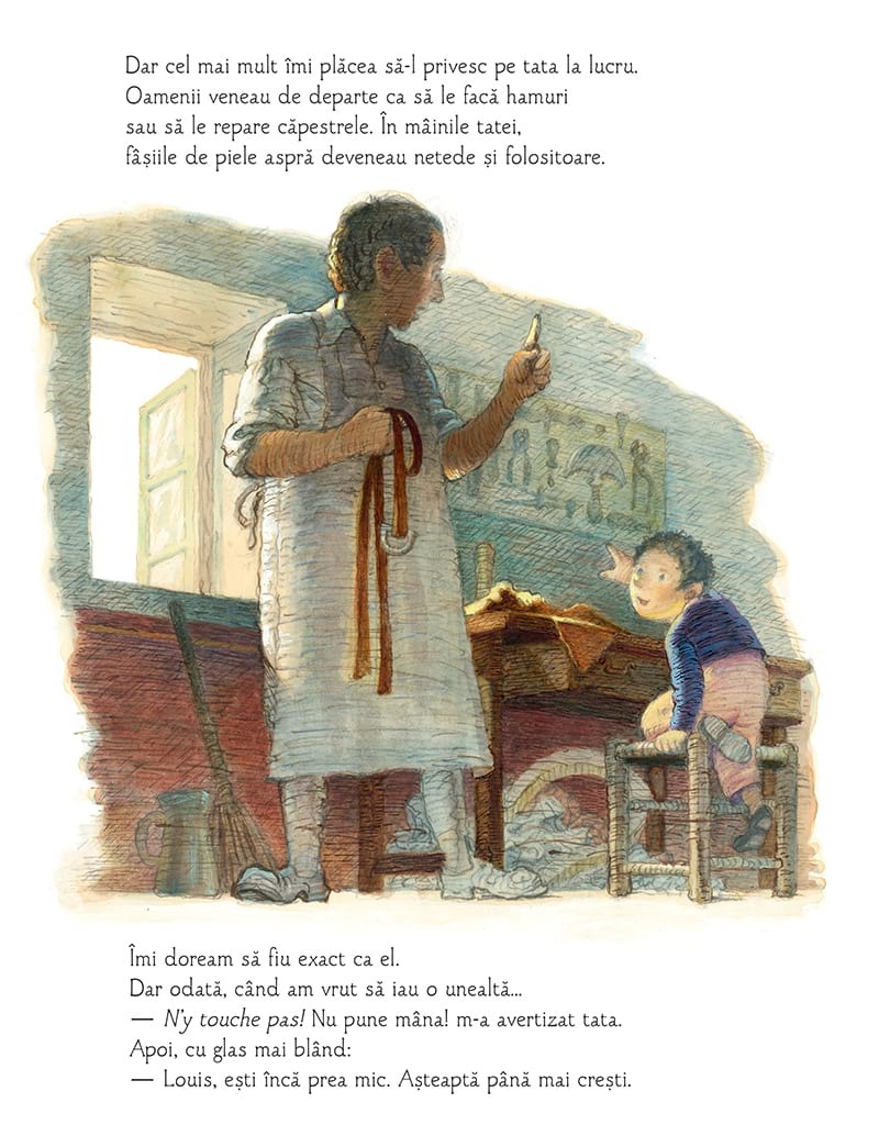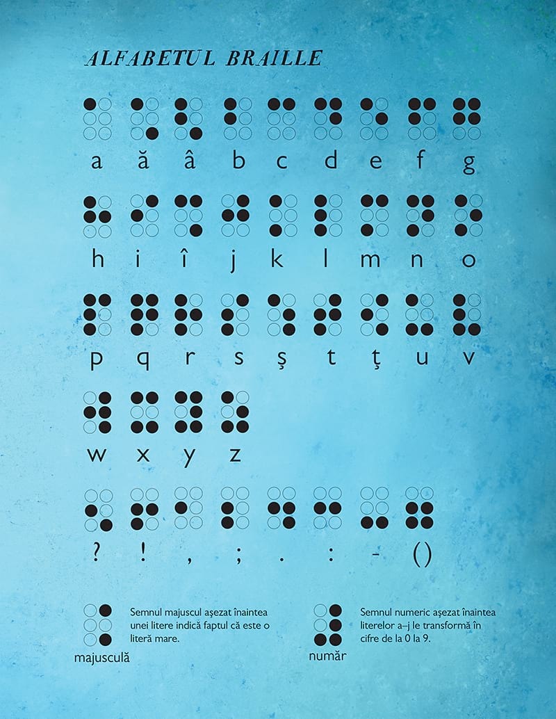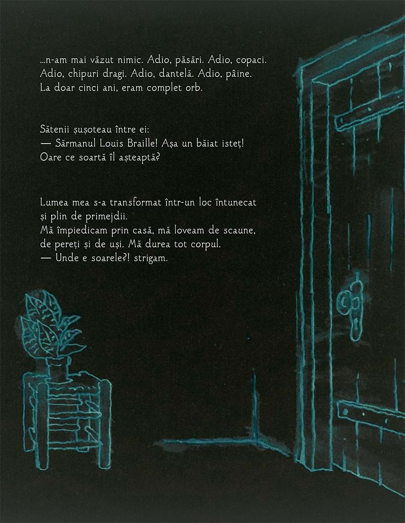Louis nu s-a născut orb. Avea numai cinci ani când și-a pierdut vederea, în urma unui accident nefericit din atelierul de pielărie al tatălui său. Era un băiat isteț și voia să trăiască la fel ca toți ceilalți oameni, iar ce își dorea mai mult și mai mult pe lume era să poată citi. Dar nici măcar la școala pentru nevăzători din Paris nu se găseau cărți potrivite pentru el. Așa că, după multă muncă și căutare, și-a inventat propriul alfabet. Mai precis, un sistem de scriere nou-nouț, în care fiecare literă era alcătuită din șase puncte în relief. În acest fel, literele puteau fi citit prin atingere, cu vârfurile degetelor.