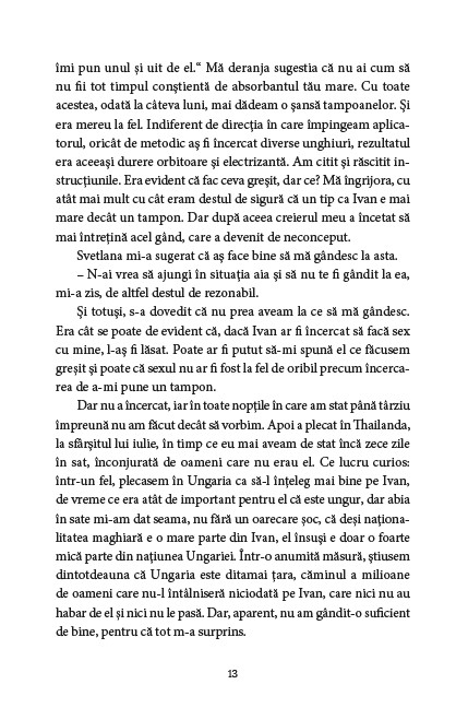 O continuare a poveștii din Idioata, un roman al devenirii și al adaptării, scris cu umor, autoironie și inteligență, cu trimiteri la autori importanți; o analiză a vieții într-un mediu multicultural.