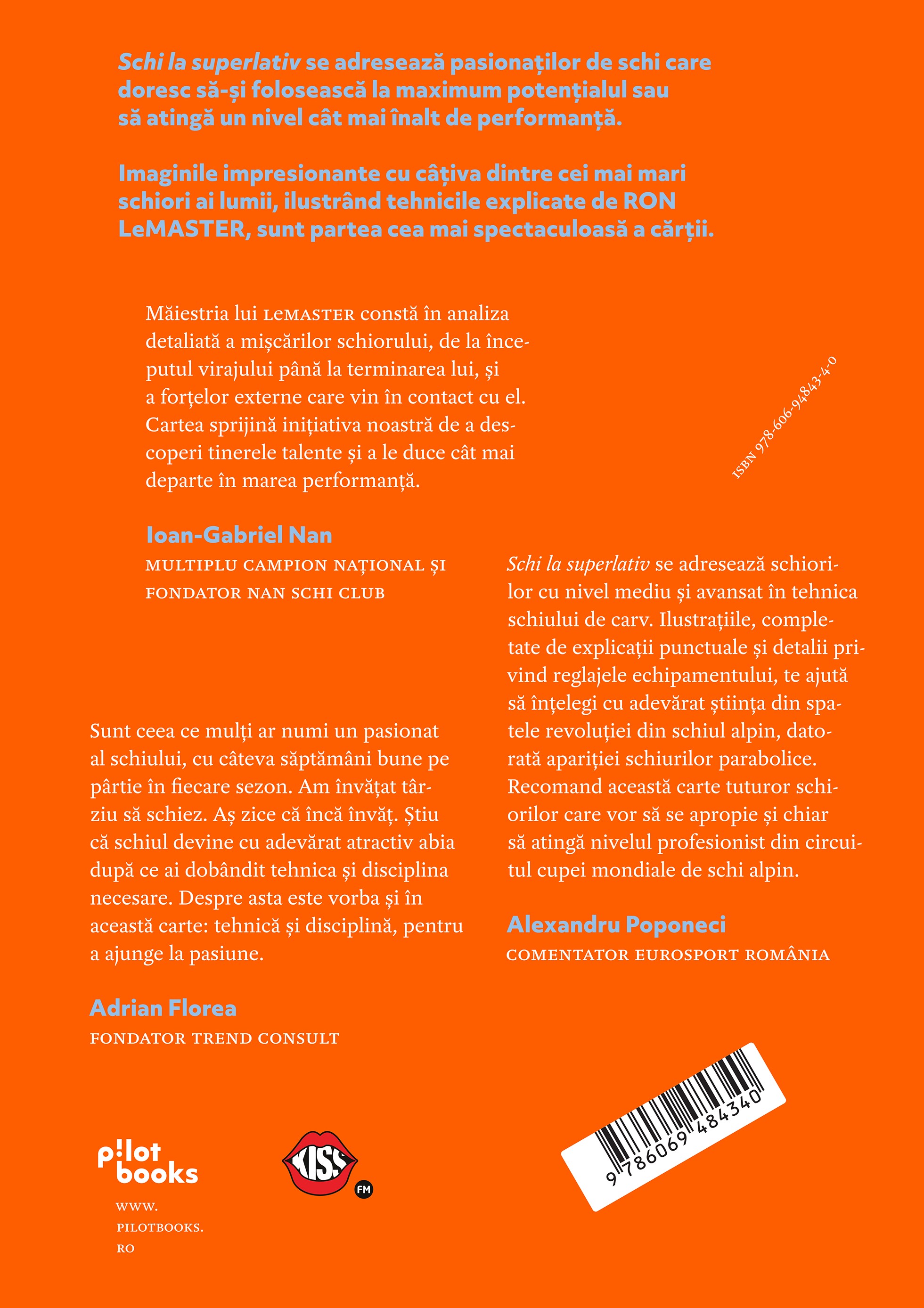 Schi la superlativ se adresează schiorilor cu nivel mediu și avansat în tehnica schiului de carv. Ilustrațiile, completate de explicații punctuale și detalii privind reglajele echipamentului, te ajută să înțelegi cu adevărat știința din spatele revoluției din schiul alpin, datorată apariției schiurilor parabolice. Recomand această carte tuturor schiorilor care vor să se apropie și chiar să atingă nivelul profesionist din circuitul cupei mondiale de schi alpin.