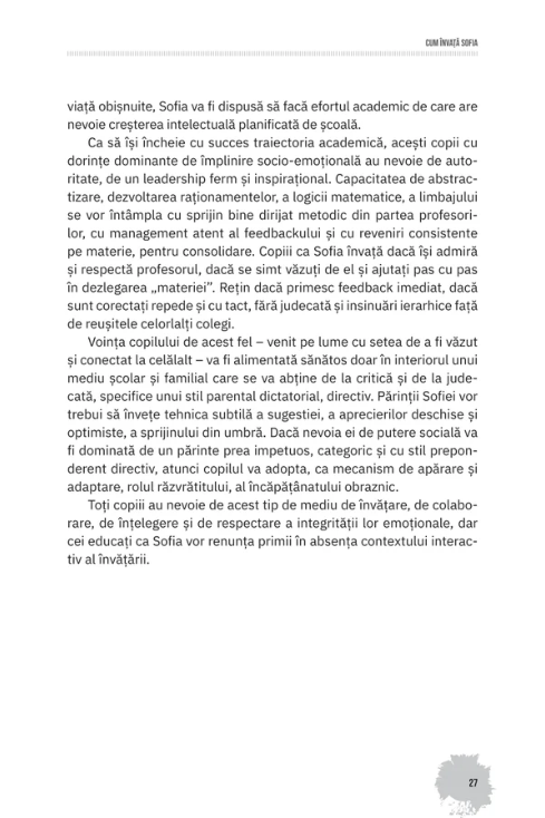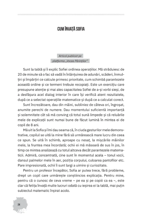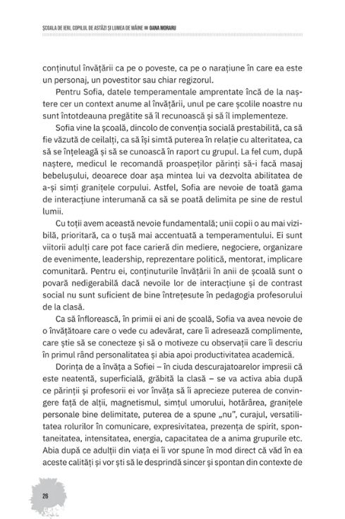 „Am adunat în această carte reflecțiile mele inspirate de experiența ca profesor, mamă și manager școlar, în speranța că măcar unele dintre ele îi pot sprijini pe tinerii părinți și profesori de astăzi – mai ales pe aceia care nu au mult timp liber la dispoziție și care simt nevoia să revină, din când în când, la astfel de informații adunate sub forma unor pastile ușor de citit.