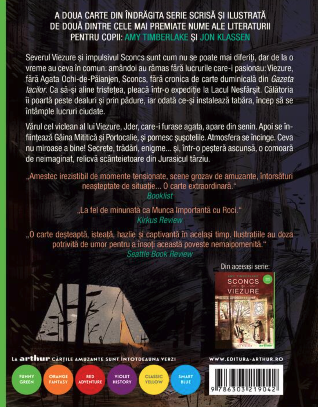 Severul Viezure și impulsivul Sconcs sunt cum nu se poate mai diferiți, dar de la o vreme au ceva în comun: amândoi au rămas fără lucrurile care-i pasionau: Viezure, fără Agata Ochi-de-Păianjen, Sconcs, fără cronica de carte duminicală din Gazeta Iacilor. Ca să-și aline tristețea, pleacă într-o expediție la Lacul Nesfârșit. Călătoria îi poartă peste dealuri și prin pădure, iar odată ce-și instalează tabăra, încep să se întâmple lucruri ciudate.