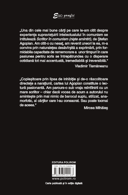 „Una din cele mai bune cărți pe care le-am citit despre experiența supraviețuirii intelectualului în comunism se intitulează Scriitor în comunism (niște amintiri), de Ștefan Agopian. Am citit-o cu nesaț, am revenit uneori la ea, m-a convins prin naturalețea desăvârșită a exprimării, prin formidabila capacitate de rememorare a unor timpuri în care pasiunea pentru scris se întrepătrundea cu o disperare cotidiană tot mai accentuată, iremediabilă și ireversibilă.” (Vladimir Tismăneanu)