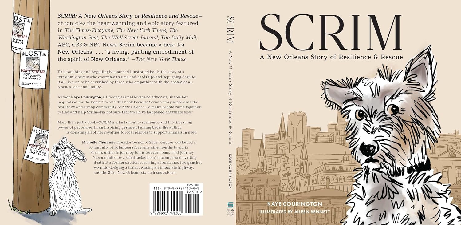 Author Kaye Courington, a lifelong animal lover and advocate, "wrote this book because Scrim’s story represents the resiliency and strong community of New Orleans. So many people came together to find and help Scrim—I’m not sure that would’ve happened anywhere else.”