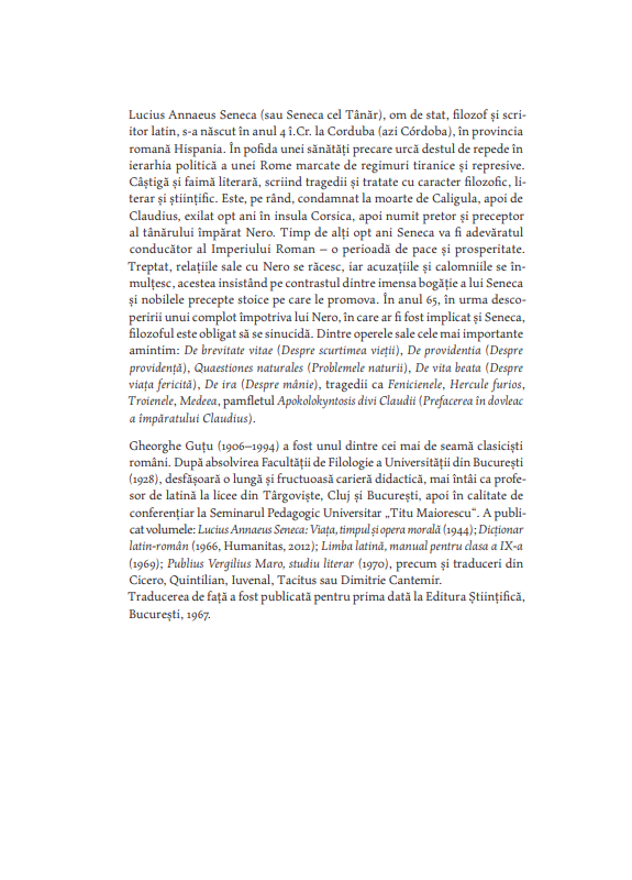 „Nici retrasă vieţuire filozofică, mângâiere comodă a unui spirit mandarin, nici viaţă politică numai, pentru care idealul este vană podoabă, ci zbatere dramatică între forma supremă a omului, înţeleptul stoic, ce ridică pe om la măsura zeilor, și tristele împrejurări ale vremii neroniene, ce-i împovărau conștiinţa târâtă în abjecţia unei epoci fără seamăn. La aceasta, intuiţia vie că trăiește un sfârșit de lume, încercarea de salvare a bunului suprem, valoarea morală, presimţirea lumii noi ce se năștea, tonul «creștin» al atâtor idei. Seneca este primul om modern.“ — GHEORGHE GUŢU