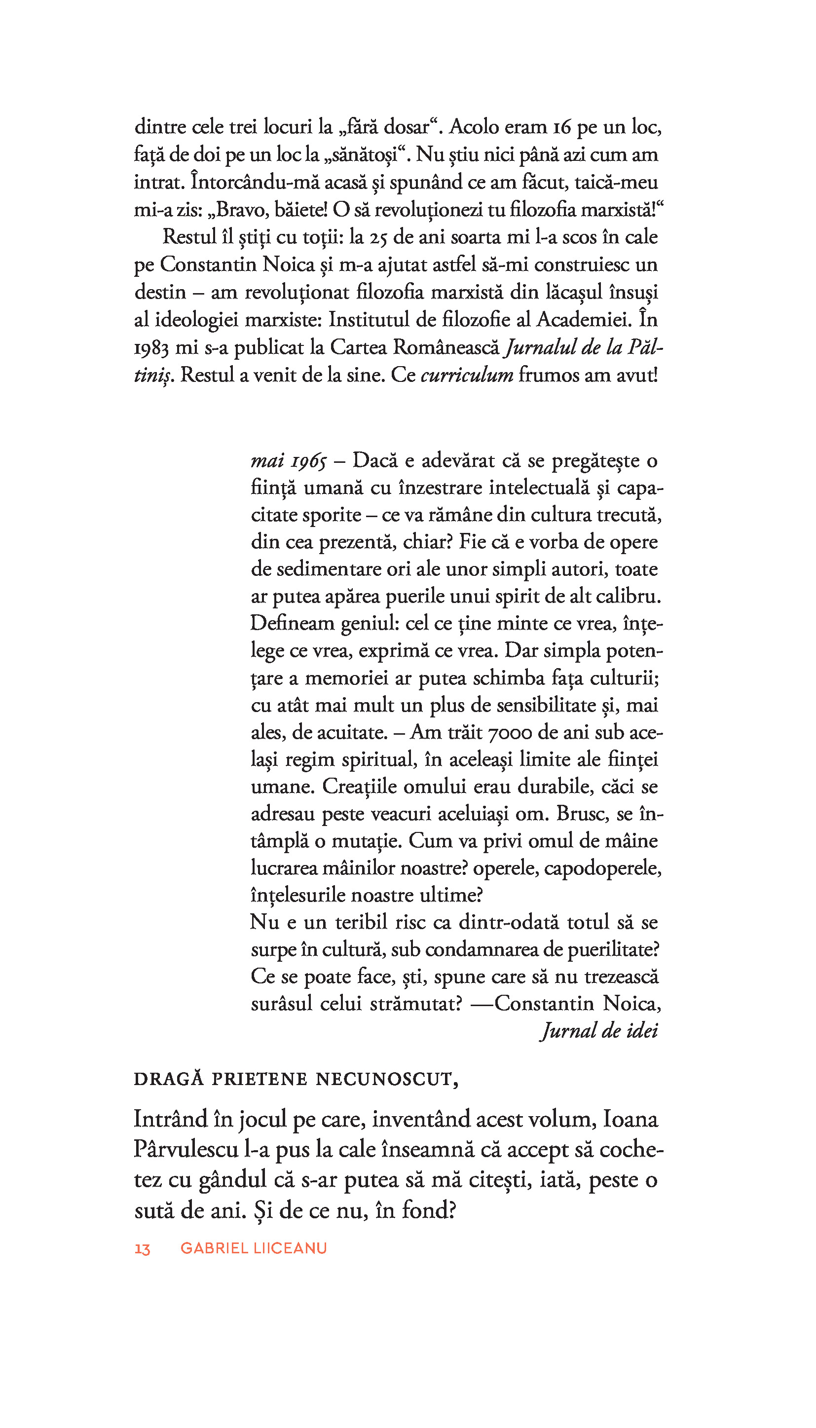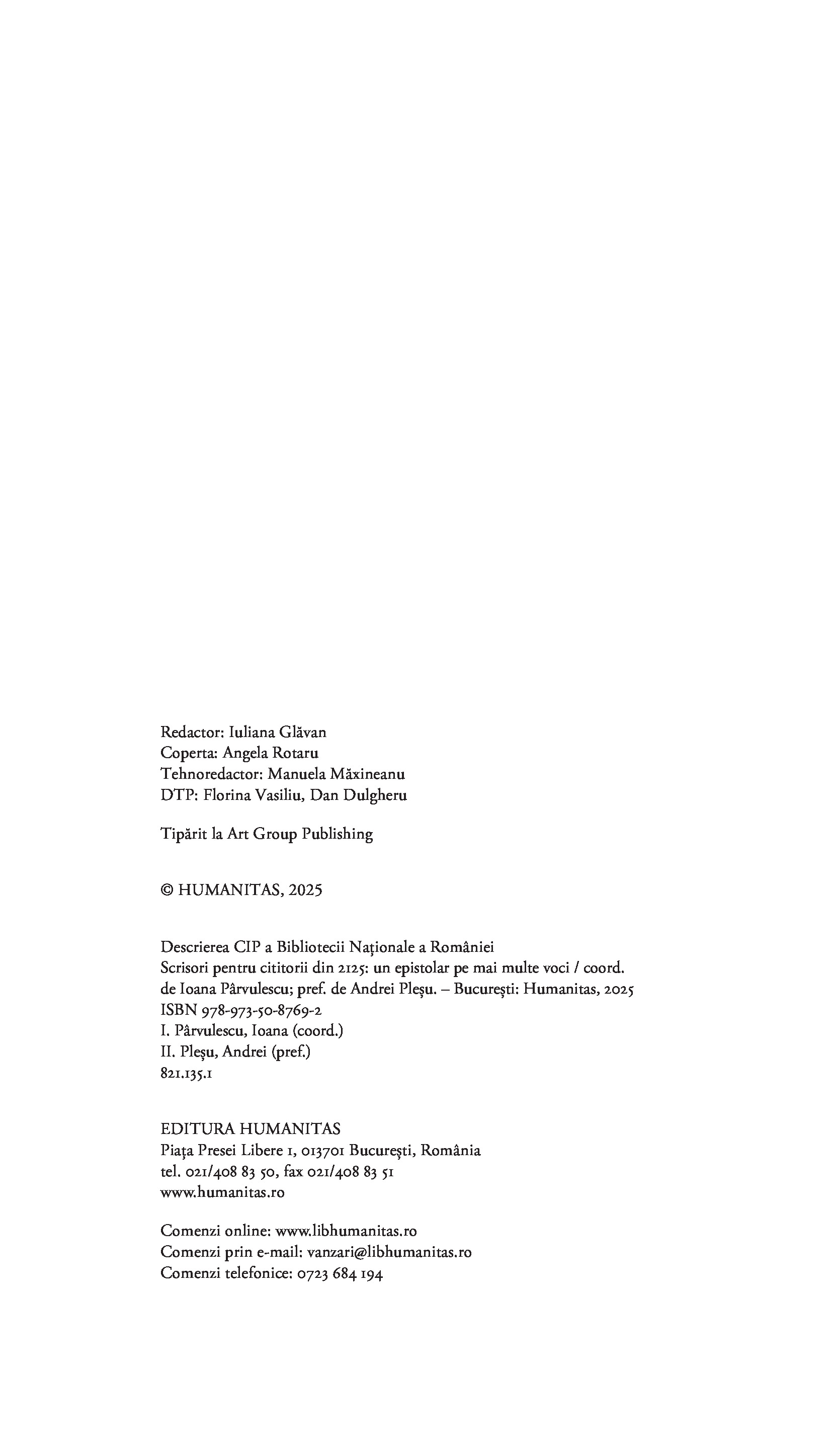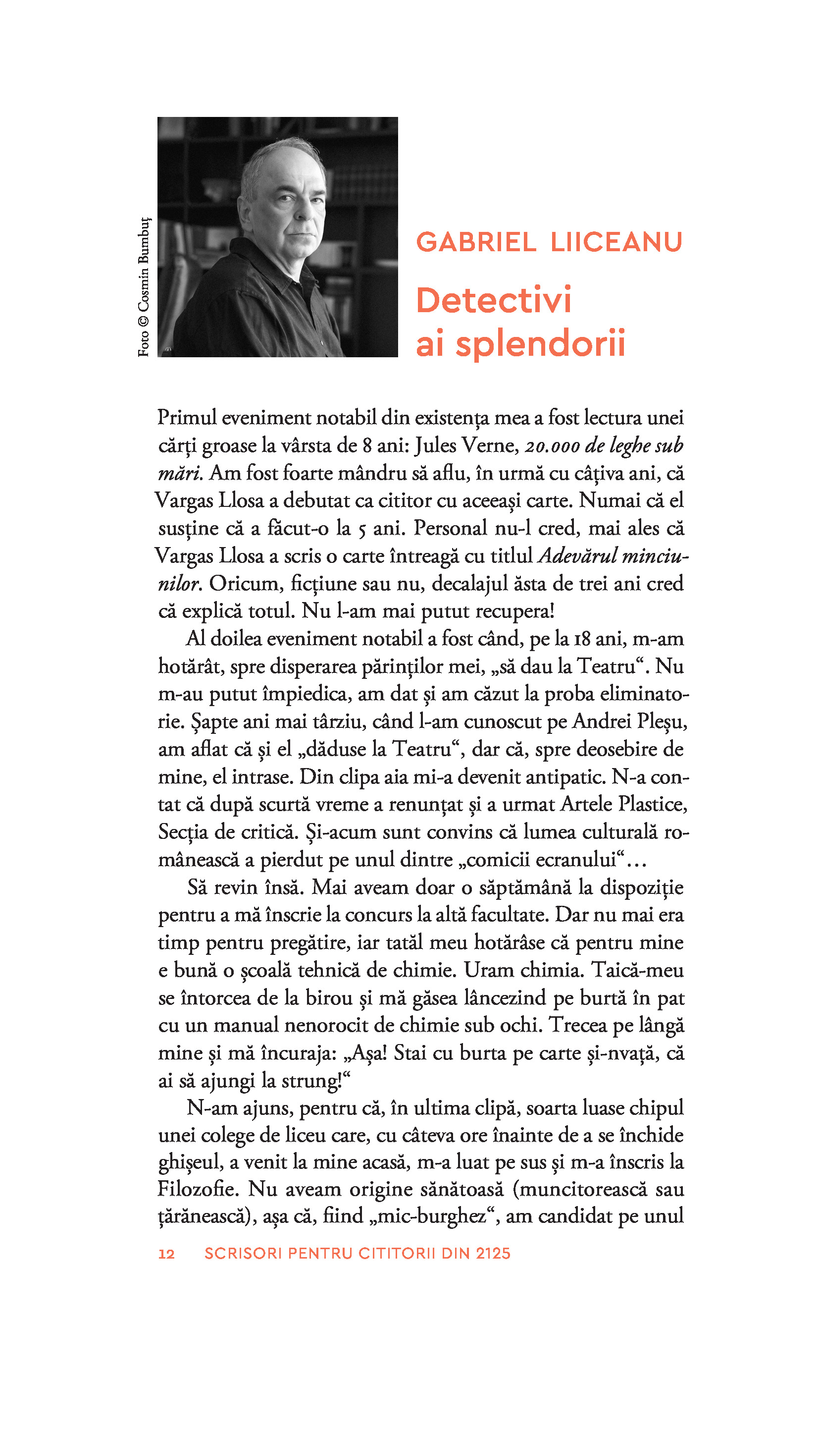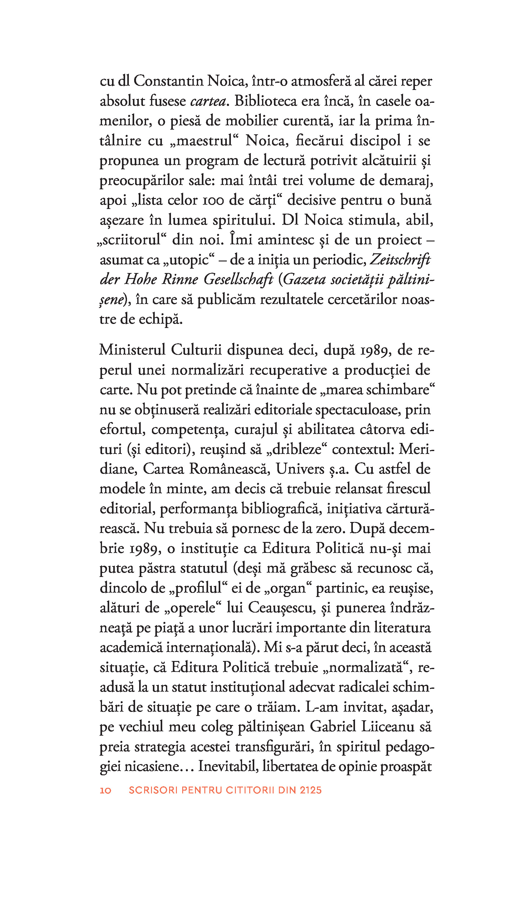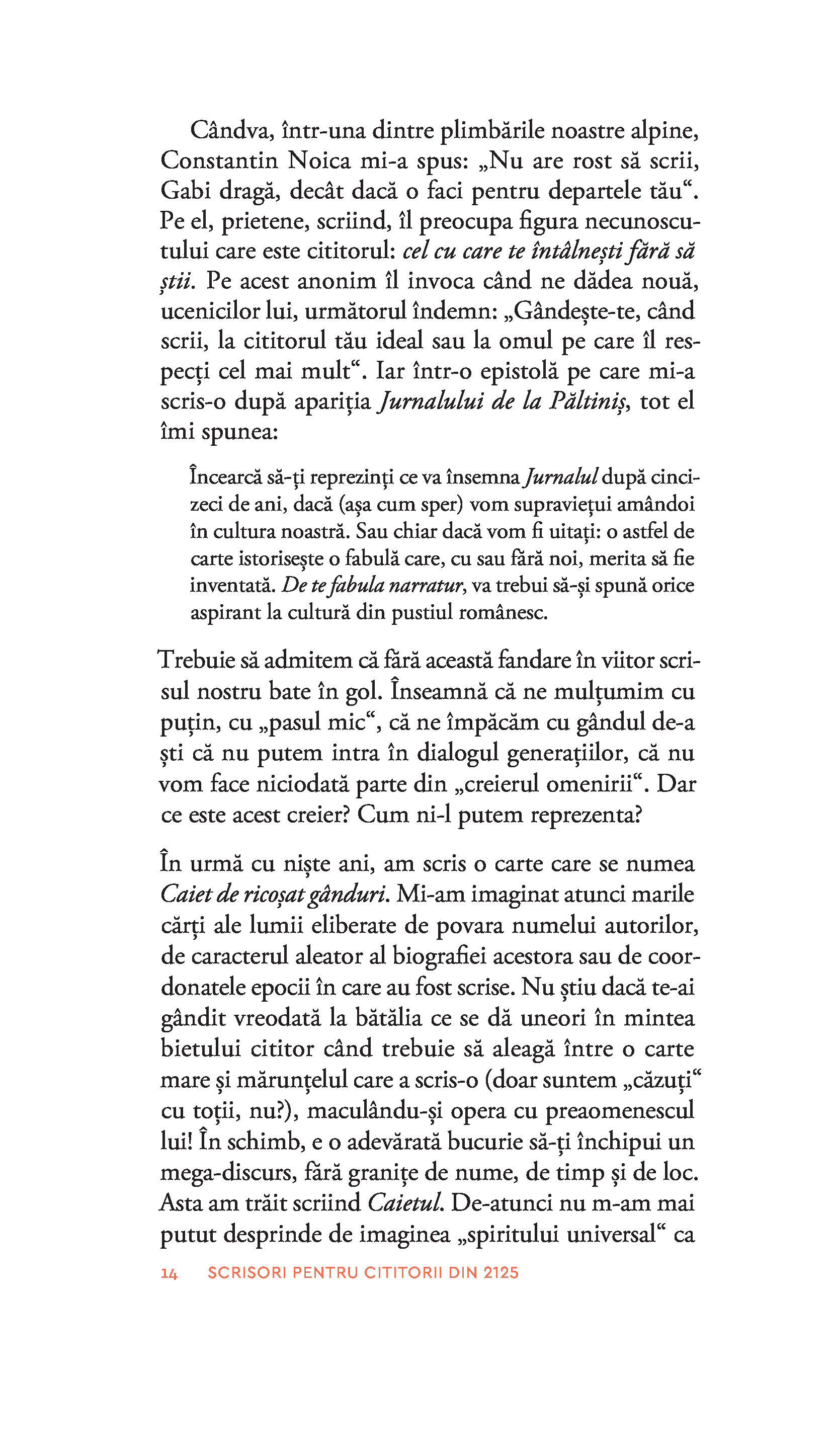 Desigur, în subtext, destinatarii ceva mai siguri ai acestor pagini sunteți dumneavoastră, contemporanii noștri, îngrijorați de tot ce ne așteaptă în anii următori. În speranța că acest semn de normalitate, inteligență și civilitate, că acest semn de viață care este cititul va exista și peste o sută de ani, prin volumul de față le trimitem salutări pe mai multe voci oamenilor din 2125. Prinse bine în actualitate și totuși depășind-o, scrisorile din volum au, cu siguranță, viitor.“