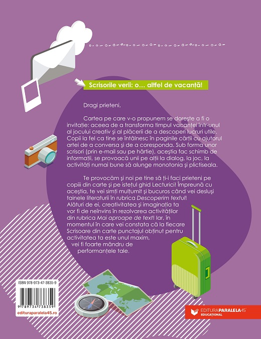 Te provocăm şi noi pe tine să ţi-i faci prieteni pe copiii din carte şi pe isteţul ghid Lecturici! Împreună cu aceştia, te vei simţi mulţumit şi bucuros când vei desluşi tainele literaturii în rubrica Descoperim textul! Alături de ei, creativitatea şi imaginaţia ta vor fi de neînvins în rezolvarea activităţilor din rubrica Mai aproape de text! Iar în momentul în care vei constata că la fiecare Scrisoare din carte punctajul obţinut pentru activitatea ta este unul maxim, vei fi foarte mândru de performanţele tale.