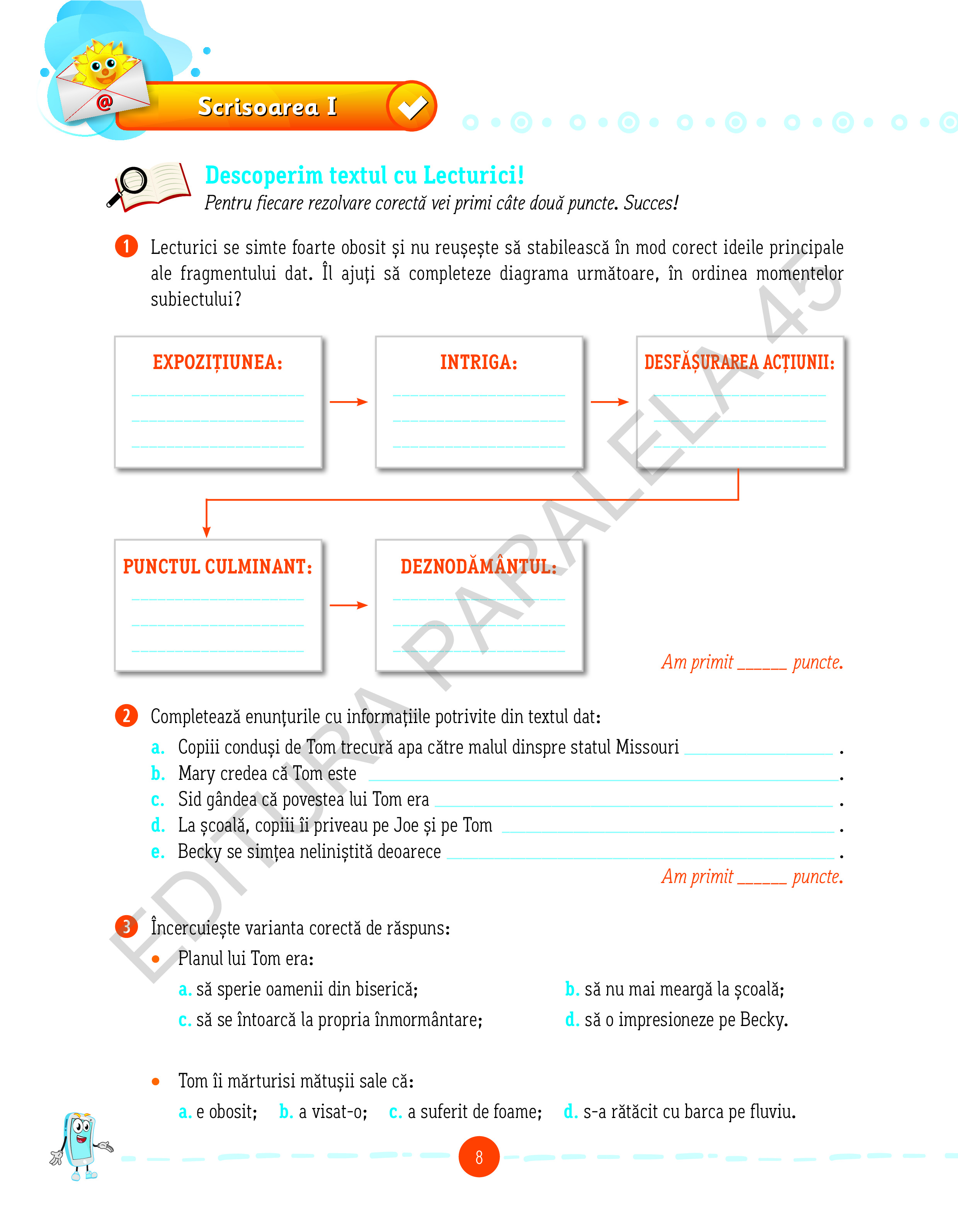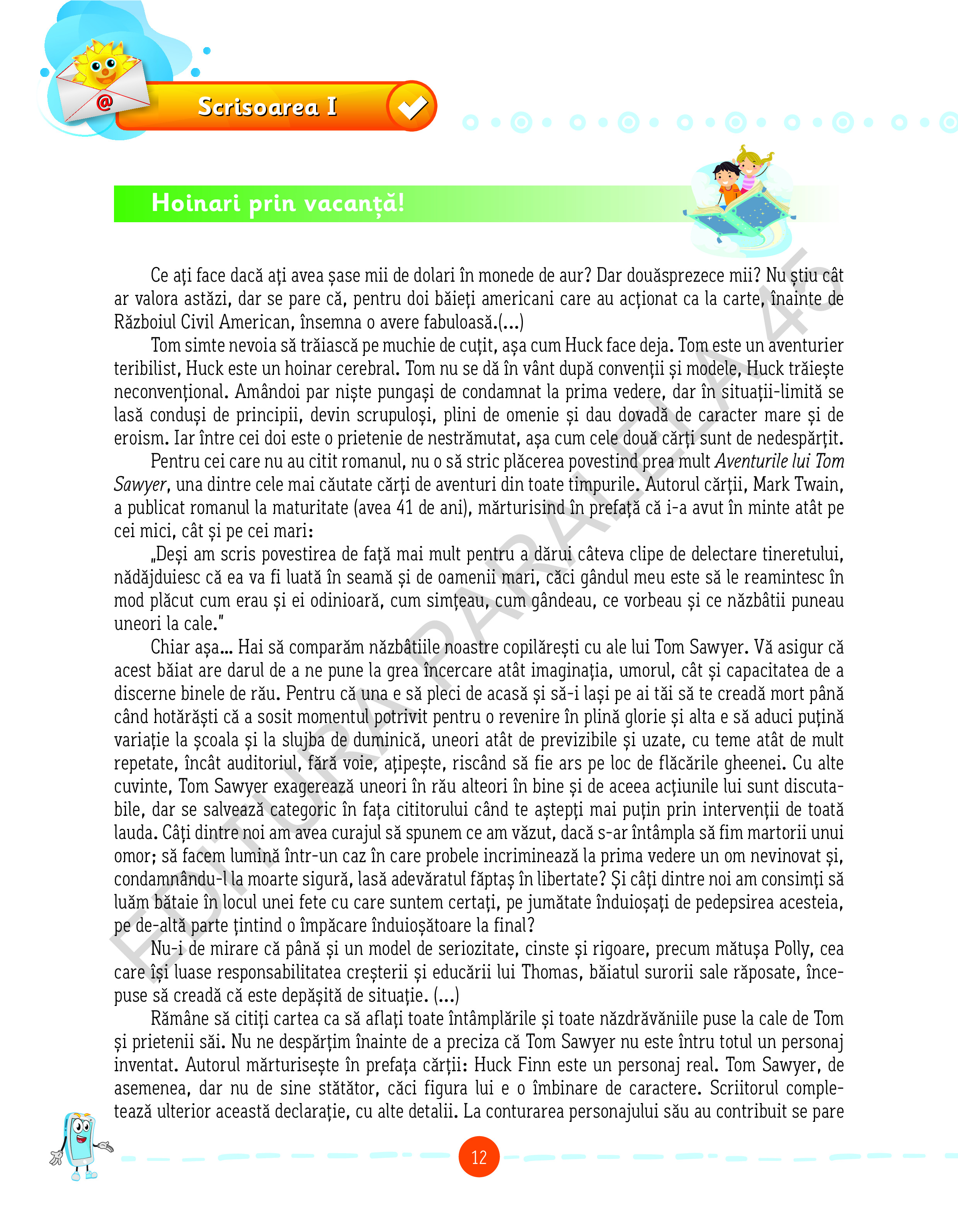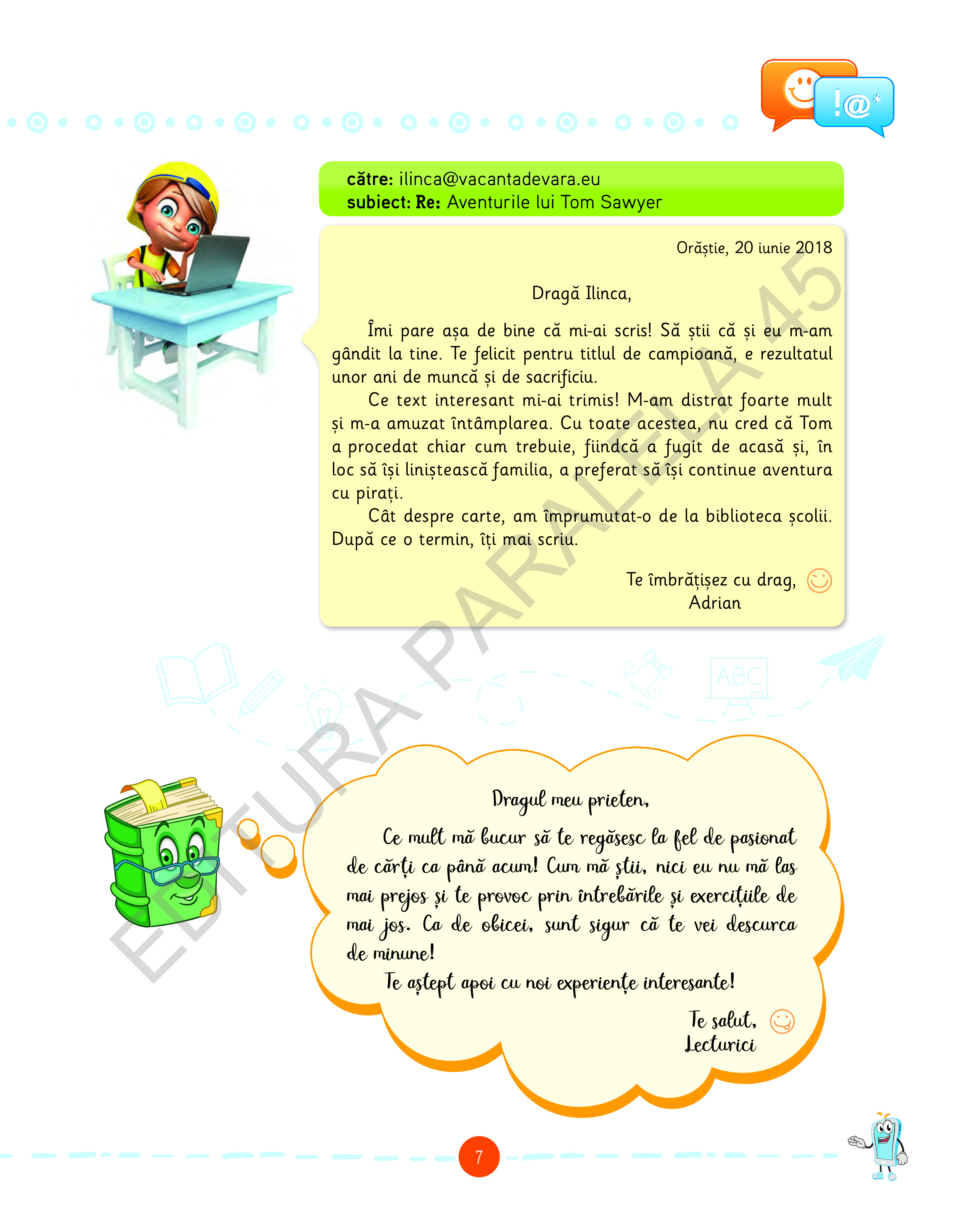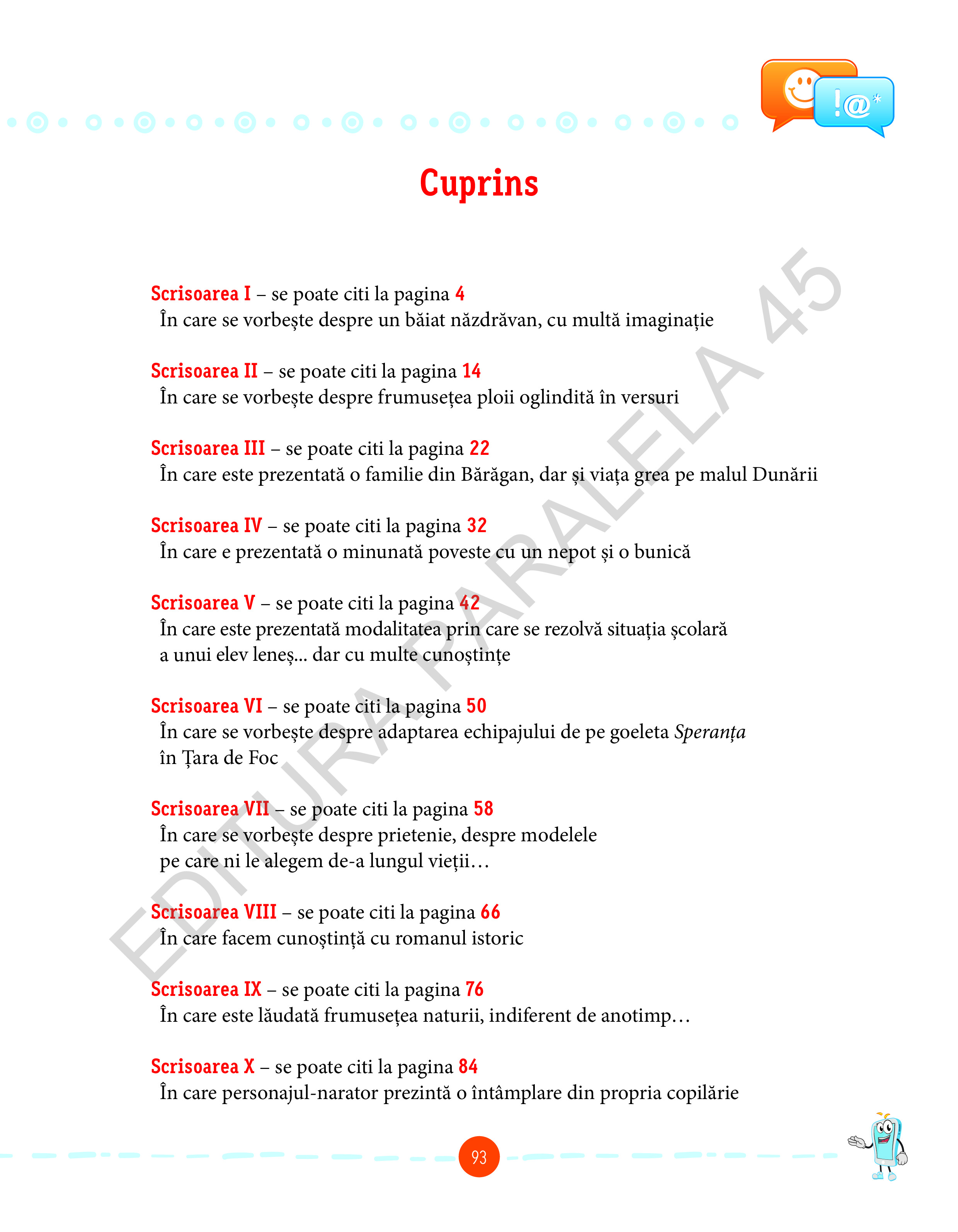 Te provocăm şi noi pe tine să ţi-i faci prieteni pe copiii din carte şi pe isteţul ghid Lecturici! Împreună cu aceştia, te vei simţi mulţumit şi bucuros când vei desluşi tainele literaturii în rubrica Descoperim textul! Alături de ei, creativitatea şi imaginaţia ta vor fi de neînvins în rezolvarea activităţilor din rubrica Mai aproape de text! Iar în momentul în care vei constata că la fiecare Scrisoare din carte punctajul obţinut pentru activitatea ta este unul maxim, vei fi foarte mândru de performanţele tale.