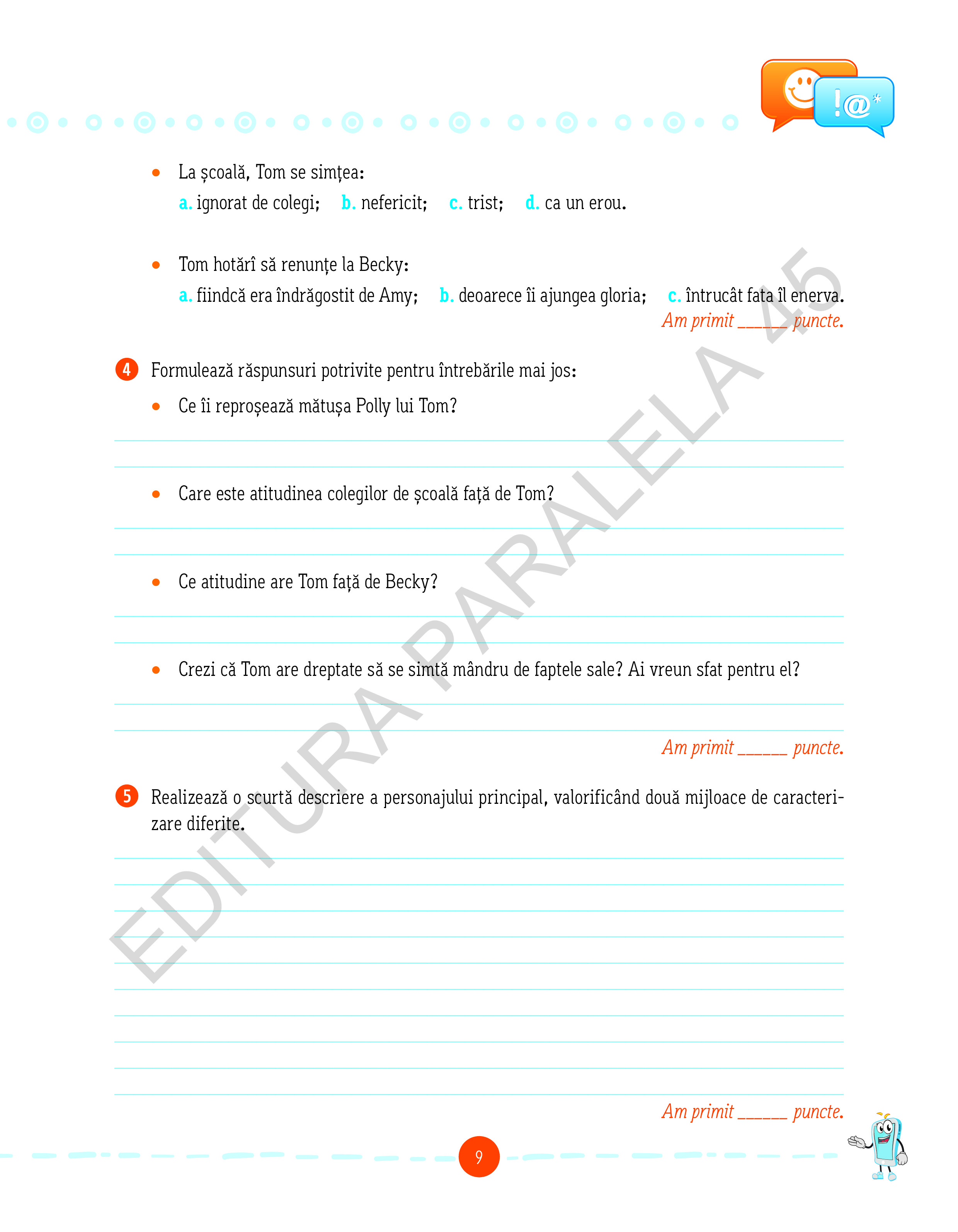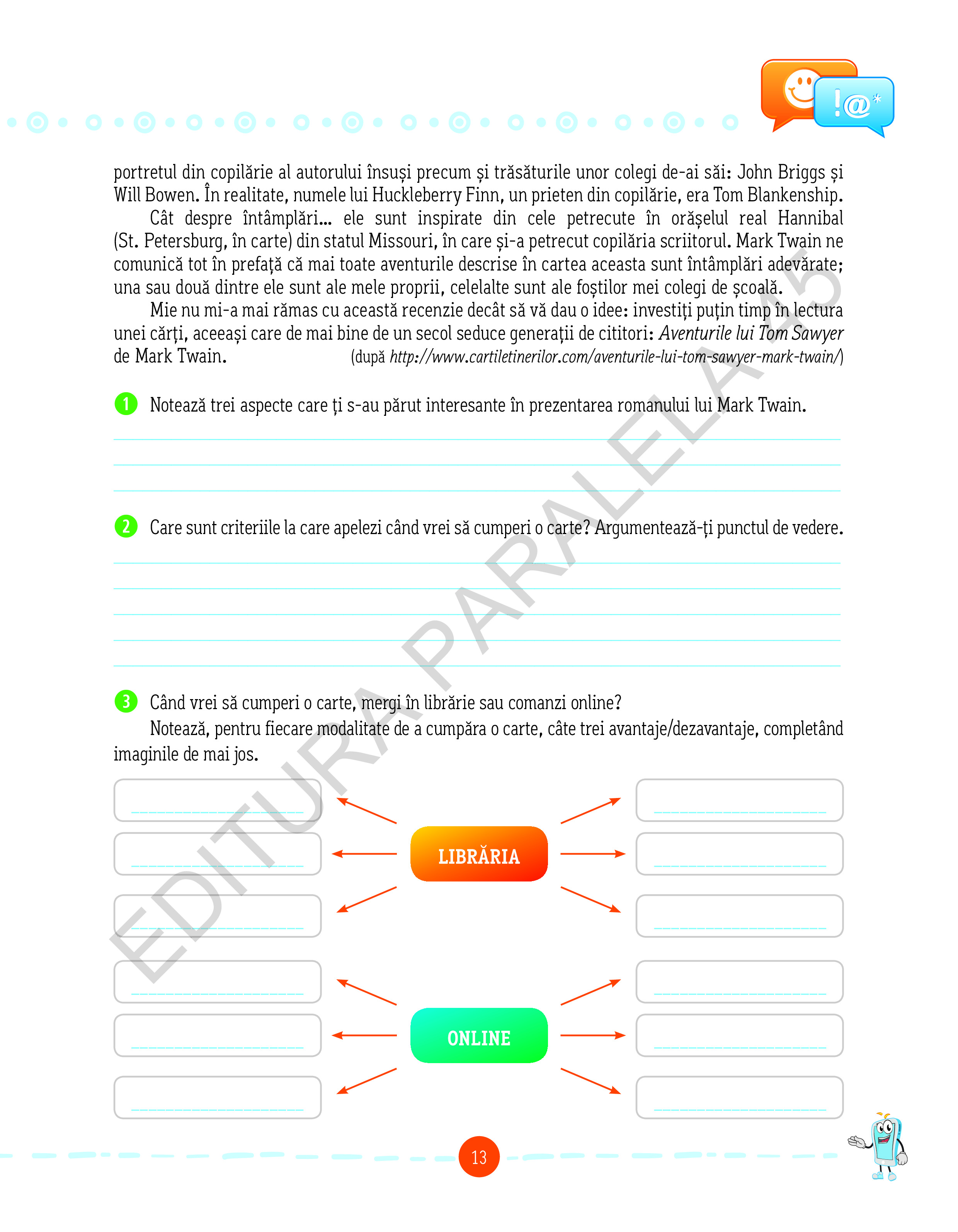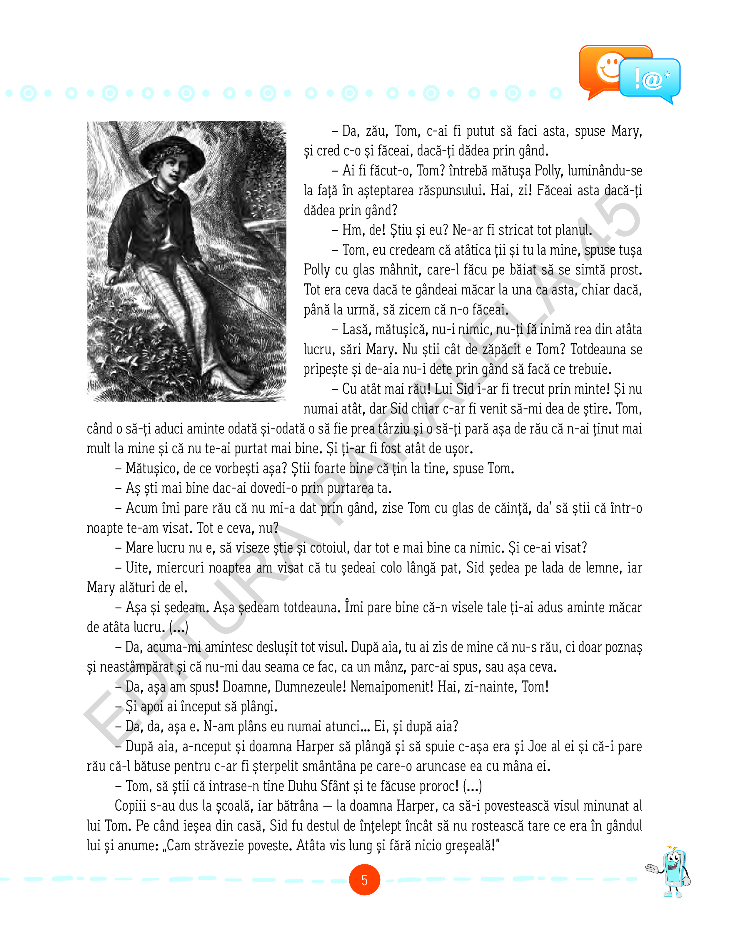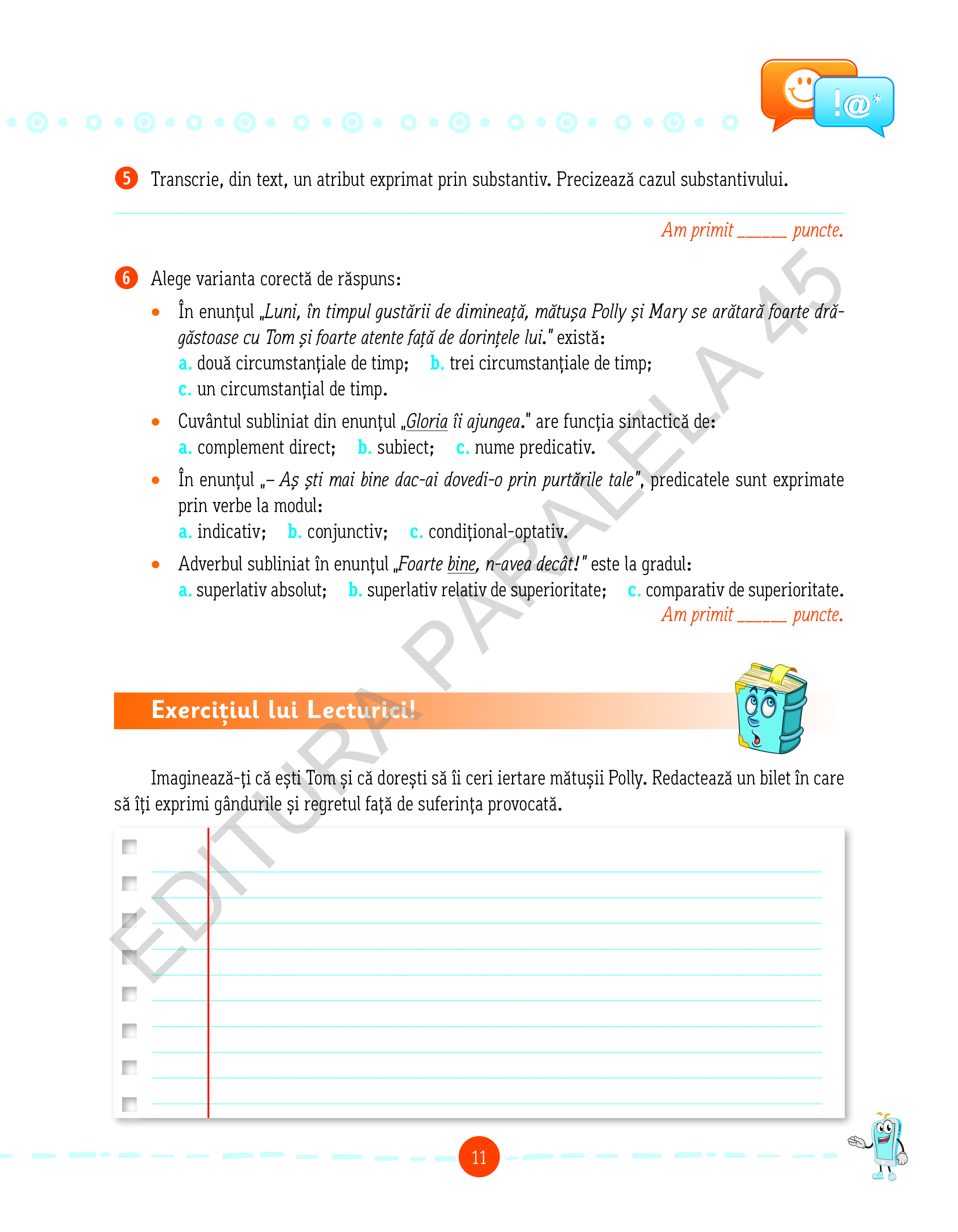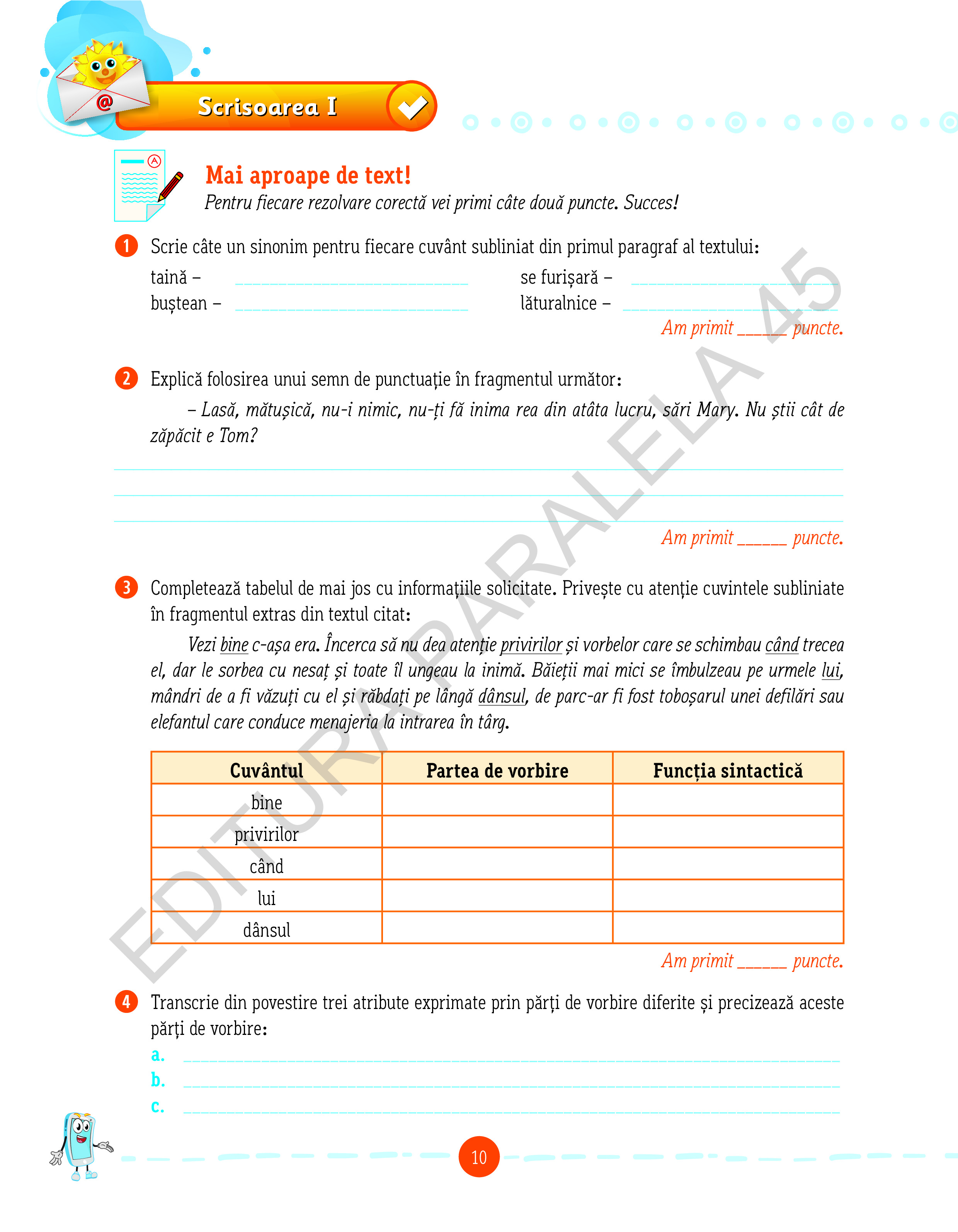 Te provocăm şi noi pe tine să ţi-i faci prieteni pe copiii din carte şi pe isteţul ghid Lecturici! Împreună cu aceştia, te vei simţi mulţumit şi bucuros când vei desluşi tainele literaturii în rubrica Descoperim textul! Alături de ei, creativitatea şi imaginaţia ta vor fi de neînvins în rezolvarea activităţilor din rubrica Mai aproape de text! Iar în momentul în care vei constata că la fiecare Scrisoare din carte punctajul obţinut pentru activitatea ta este unul maxim, vei fi foarte mândru de performanţele tale.