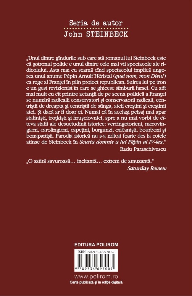„Unul dintre gândurile sub care stă romanul lui Steinbeck este că șotronul politic e unul dintre cele mai vii spectacole ale ridicolului. Asta mai cu seamă când spectacolul implică ungerea unui anume Pépin Arnulf Héristal (quel nom, mon Dieu!) ca rege al Franței în plin proiect republican. Suirea lui pe tron e un gest revizionist în care se ghicesc sâmburii farsei. Cu atât mai mult cu cât printre actanții de pe scena politică a Franței se numără radicalii conservatori și conservatorii radicali, centriștii de dreapta și centriștii de stânga, ateii creștini și creștinii atei. Și dacă ar fi doar ei. Numai că în același peisaj mai apar staliniști, troțkiști și hrușciovnici, spre a nu mai vorbi de câteva stafii ale desuetudinii istorice: vercingetorieni, merovingieni, carolingieni, capețini, burgunzi, orléaniști, bourboni și bonapartiști. Parodia istorică nu s-a ridicat foarte des la cotele atinse de Steinbeck în Scurta domnie a lui Pépin al IV-lea.” (Radu Paraschivescu)