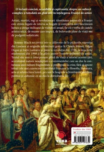 Jeremy Black ne invită într-o călătorie de la picturile rupestre din Lascaux și originile arhitecturii gotice la Claude Monet, Edgar Degas și frații Lumière și până la revoluția din 1789, la mișcările studențești din 1968 și la gilets jaunes (vestele galbene) de astăzi. Textul său este o interpretare plină de viață a istoriei acestei țări, accentuând natura neașteptată a evenimentelor care au dus la conturarea unei națiuni fragmentate și predispuse la crize, fără să ignore totuși cele mai cunoscute contribuții franceze la filosofia, literatura, arta și arhitectura lumii, pe care le leagă de schimbările militare, politice și culturale ce au dus la dezvoltarea lor.