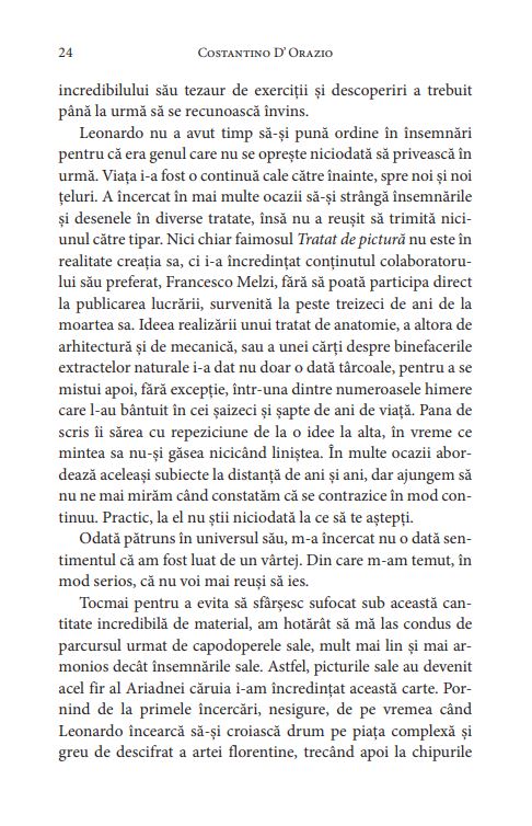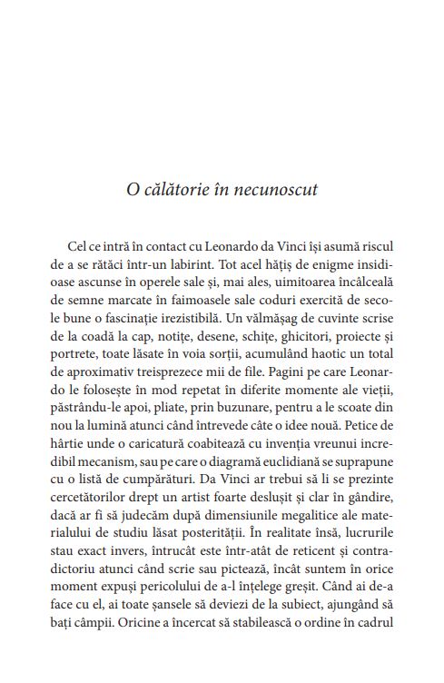 Pictor, scriitor, inventator, om de știință, muzician, arhitect... Atât de eclecticul Leonardo da Vinci este considerat unul dintre cele mai mari genii ale umanității, autorul celui mai faimos tablou din lume, precursorul a numeroase invenții moderne, rămânând însă unul dintre cele mai enigmatice personaje din istorie. Viața și opera lui alcătuiesc un adevărat rebus pe care Costantino d’Orazio îl descifrează pe parcursul acestei cărți într-o nouă cheie, folosind tablourile ca pe un fir al Ariadnei în explorarea minții labirintice a artistului. Astfel, fiecare pictură constituie o bună ocazie pentru aprofundarea unei laturi a capricioasei personalități a lui Leonardo, întrucât toate domeniile de cercetare cărora li s-a dedicat acesta – de la anatomie la studiul naturii, de la inginerie la muzică – și-au găsit o formă de exprimare artistică. Autorul ne va ajuta să înțelegem acele detalii care, asemenea pieselor unui puzzle, conțin indiciile unui mare tablou, cu titlul: Cine a fost, de fapt, Leonardo da Vinci?