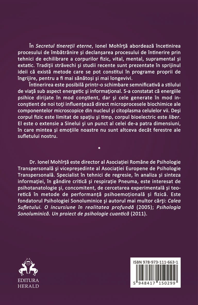 In Secretul tineretii eterne, Ionel Mohirta abordeaza incetinirea procesului de imbatranire si declansarea procesului de intinerire prin tehnici de echilibrare a corpurilor fizic, vital, mental, supramental si extatic. Traditii stravechi si studii recente sunt prezentate in sprijinul ideii ca exista metode care se pot constitui in programe proprii de ingrijire, pentru a fi mai sanatosi si mai longevivi. Intinerirea este posibila printr-o schimbare semnificativa a stilului de viata sub aspect energetic si informational. S-a constatat ca energiile psihice dirijate in mod constient, dar si cele generate in mod inconstient de noi toti influenteaza direct microprocesele biochimice ale componentelor microscopice din nucleul si citoplasma celulelor vii. Desi corpul fizic este limitat de spatiu si timp, corpul bioelectric este liber. El este o extensie a Sinelui si un punct al celei de-a patra dimensiuni, in care mintea si emotiile noastre nu sunt altceva decat ferestre ale sufletului nostru.