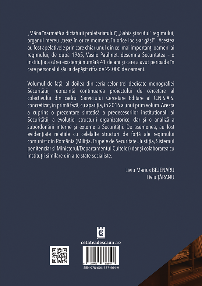 Volumul de față, al doilea din seria celor trei dedicate monografiei Securității, reprezintă continuarea proiectului de cercetare al colectivului din cadrul Serviciului Cercetare Editare al C.N.S.A.S. concretizat, în primă fază, cu apariția, în 2016 a unui prim volum.