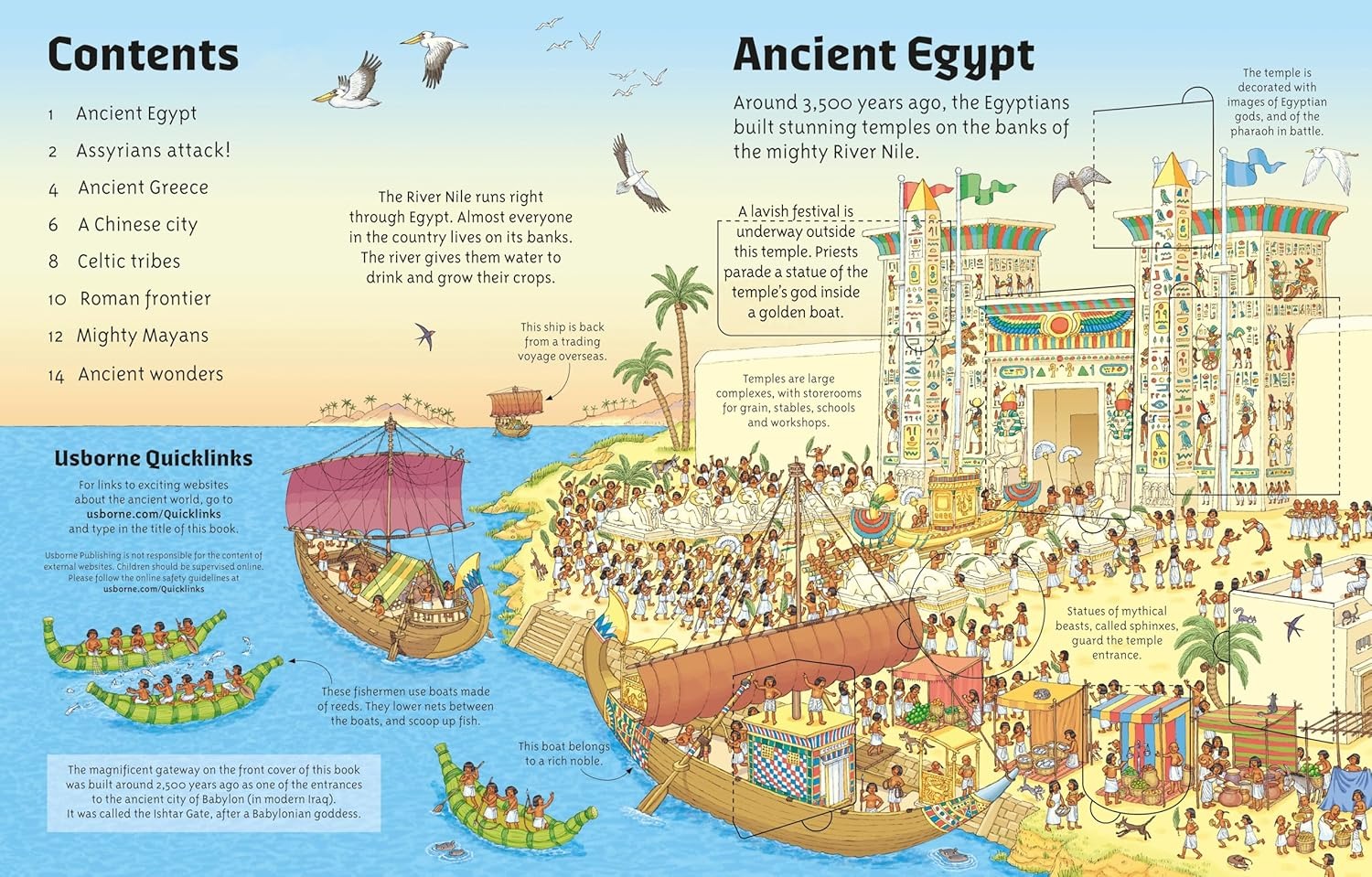 Eight scenes show readers all around the cities, countryside, and mighty monuments of several incredible ancient civilisations - from the dawn of civilization in Ancient Egypt, to the rise of the great Mayan culture in Central America.