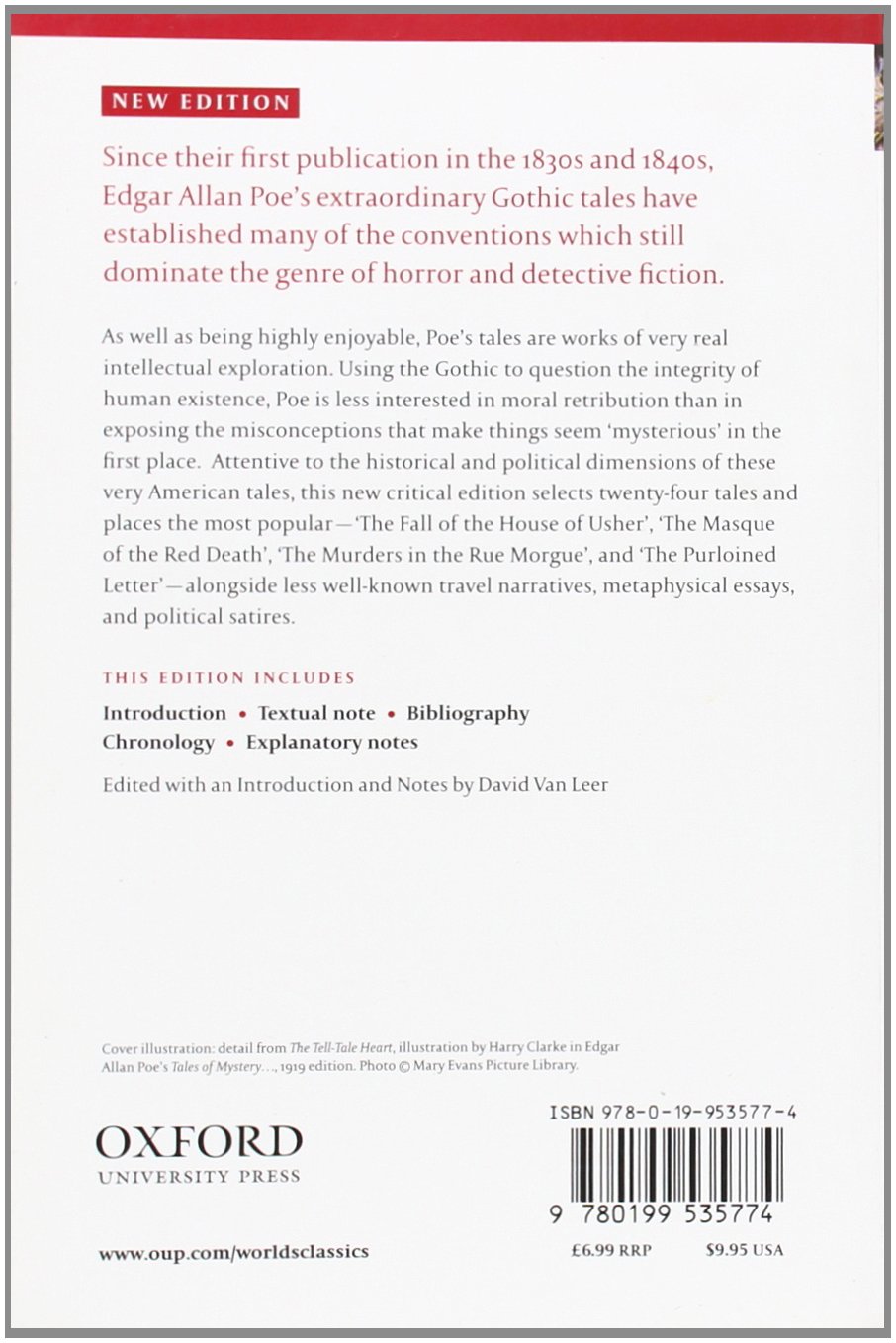 Edgar Allan Poe's Gothic tales have established themselves as classics of horror fiction, and as the inventor of the modern mystery, Poe created many of the conventions which still dominate the genre of detective fiction. Attentive to the historical and political dimensions of these very American tales, this new selection of twenty-four tales places the most popular--"The Fall of the House of Usher," "The Masque of the Red Death," "The Murders in the Rue Morgue," and "The Purloined Letter"--alongside less well-known travel narratives, metaphysical essays, and political satires.