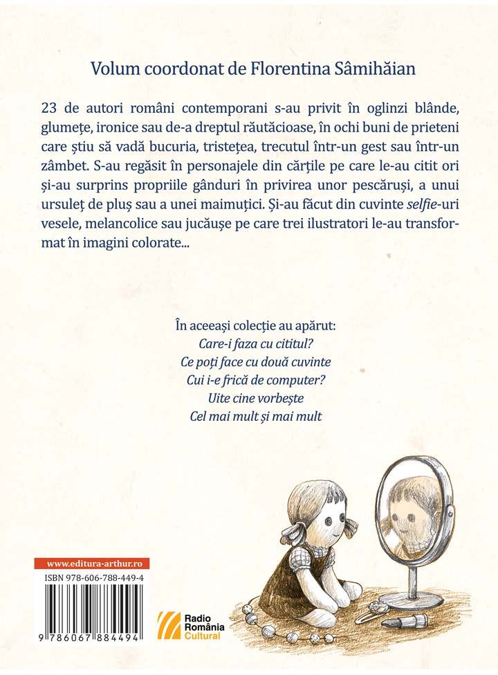 23 de autori români contemporani s-au privit în oglinzi blânde, glumețe, ironice sau de-a dreptul răutăcioase, în ochi buni de prieteni care știu să vadă bucuria, tristețea, trecutul într-un gest sau într-un zâmbet. S-au regăsit în personajele din cărțile pe care le-au citit ori și-au surprins propriile gânduri în privirea unor pescăruși, a unui ursuleț de pluș sau a unei maimuțici. Și-au făcut din cuvinte selfie-uri vesele, melancolice sau jucăușe pe care trei ilustratori le-au transformat în imagini colorate...