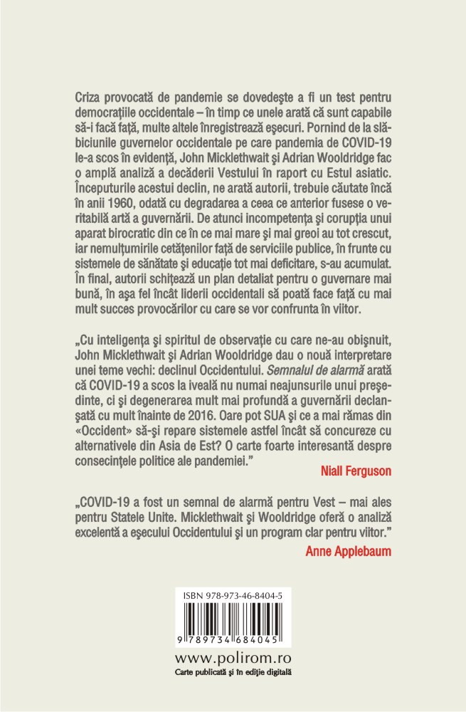 „Cu inteligenţa şi spiritul de observaţie cu care ne-au obişnuit, John Micklethwait şi Adrian Wooldridge dau o nouă interpretare unei teme vechi: declinul Occidentului. Semnalul de alarmă arată că COVID-19 a scos la iveală nu numai neajunsurile unui preşedinte, ci şi degenerarea mult mai profundă a guvernării declanşată cu mult înainte de 2016. Oare pot SUA şi ce a mai rămas din «Occident» să-şi repare sistemele astfel încît să concureze cu alternativele din Asia de Est? O carte foarte interesantă despre consecinţele politice ale pandemiei.” (Niall Ferguson)