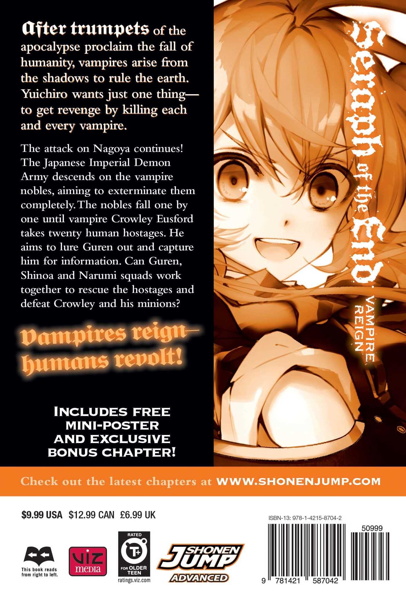 The attack on Nagoya continues! The Japanese Imperial Demon Army descends on the vampire nobles, aiming to exterminate them completely. The nobles fall one by one until vampire Crowley Eusford takes twenty human hostages. He aims to lure Guren out and capture him for information.