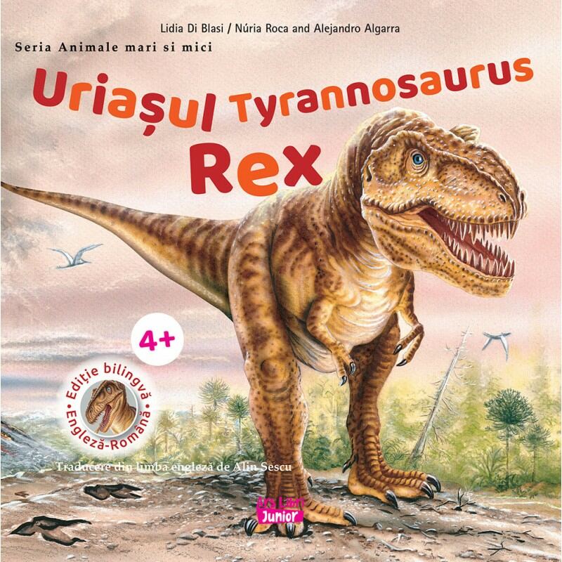• Uriașul tyrannosaurus rex - Bun venit în lumea tiranozaurului! Călătorește în urmă cu milioane de ani în compania acestui dinozaur uriaș. Vei fi uimit ce grei și ce mari erau, ce picioare puternice și ce dinți înfricoșători aveau. Vei învăța cum mâncau tiranozaurii și cum se apărau împotriva celorlalți dinozauri când a apărut regele. Află de ce au dispărut și cum le-am descoperit scheletele. Pe lângă realisticele ilustrații color, această carte include texte atât în limba engleză, cât și în limba română, dar și o pagină cu alte informații interesante despre dinozauri.