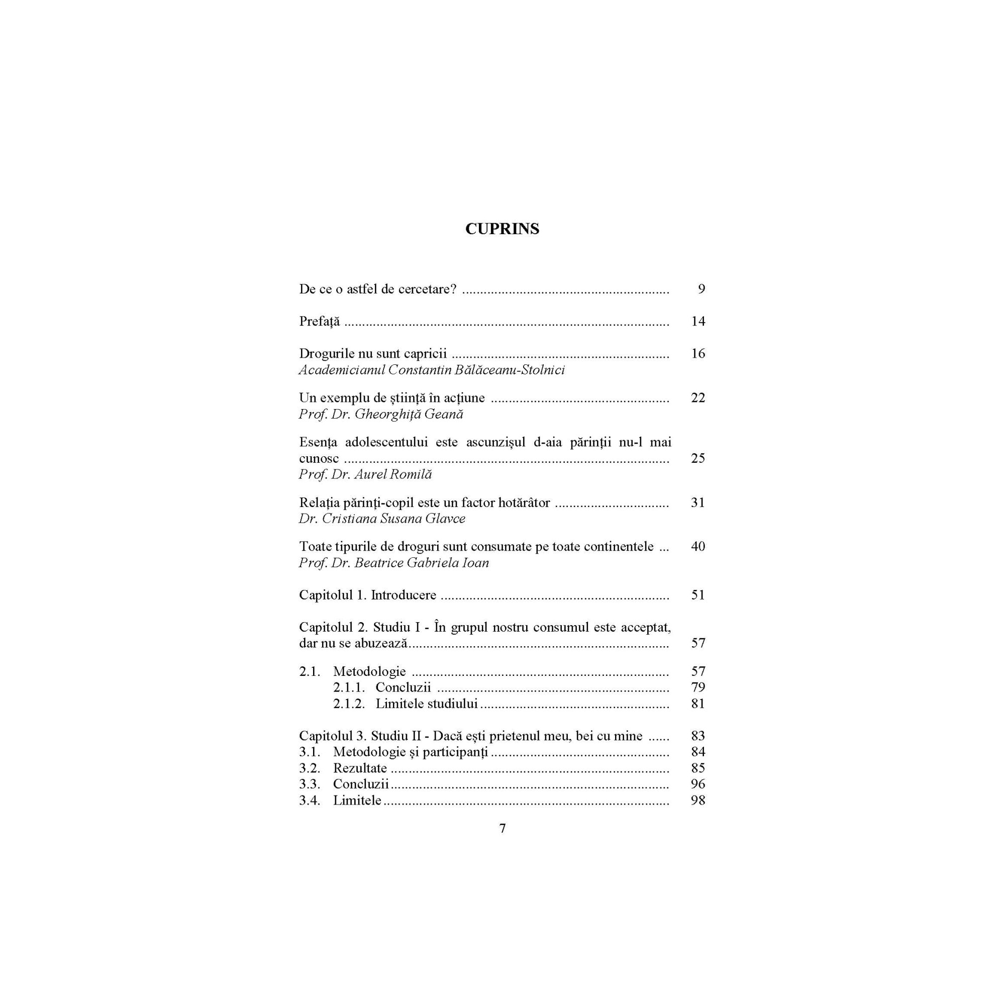 Veti observa ca nu este inclusa o parte teoretica a cercetarii, deoarece analizele istorice, antropologice, culturale si medicale alaturi de aspectele psihologice cat si psihoterapeutice ale consumului de substante au fost publicate anterior in volumul Drogurile, o carte obligatorie (Ed. Eikon, Bucuresti, 2018), o carte de mare interes mai ales pentru parinti si adolescenti. Ambele parti daca ar fi fost cuprinse intr-un singur volum ar fi insemnat o lucrare mult prea ampla. Practic vorbind, lucrarea de doctorat a cuprins 7 capitole teoretice. Primul capitol a inclus motivatia si scopul lucrarii, drogurile in istoria umanitatii, epoca pietrei cioplite-Paleolitic, Vechiul Testament, Egipt-studiul mumiilor, China, Africa si Europa. Capitolul al doilea a analizat perspectiva antropologica a drogurilor cu specific pe samanism, cu precizari ale cercetarilor lui Mircea Eliade si Ioan Petre Culianu si cu comentarii despre antropologia consumului de tutun si alcool. Capitolul al treilea facea referire la aspectele culturale ale consumului de droguri, incluzand teorii cultural explicative, drogurile, vracii, samanii, drogurile si muzica, religia, sexualitatea, drogurile in cultura romana si o noua cultura a drogurilor, cultura online. Capitolul al patrulea de mai scurte dimensiuni, cuprinde o analiza a aspectelor economice, traficul de droguri, infractiunile, cifre despre consumul de droguri in Europa si Romania, studii europene si nationale. Capitolul al cincilea cuprinde aspectele medicale ale consumului de substante, diagnosticul dependentei, neuropsihologia si neurobiologia dependentei, efectele fizice si psihice ale consumul de substante. Capitolul al saselea prezenta tratamentul dependentei, interventii psihoterapeutice, psihoterapia cognitiv comportamentala, terapia de grup, terapia de familie si consilierea maritala si recuperarea spirituala.