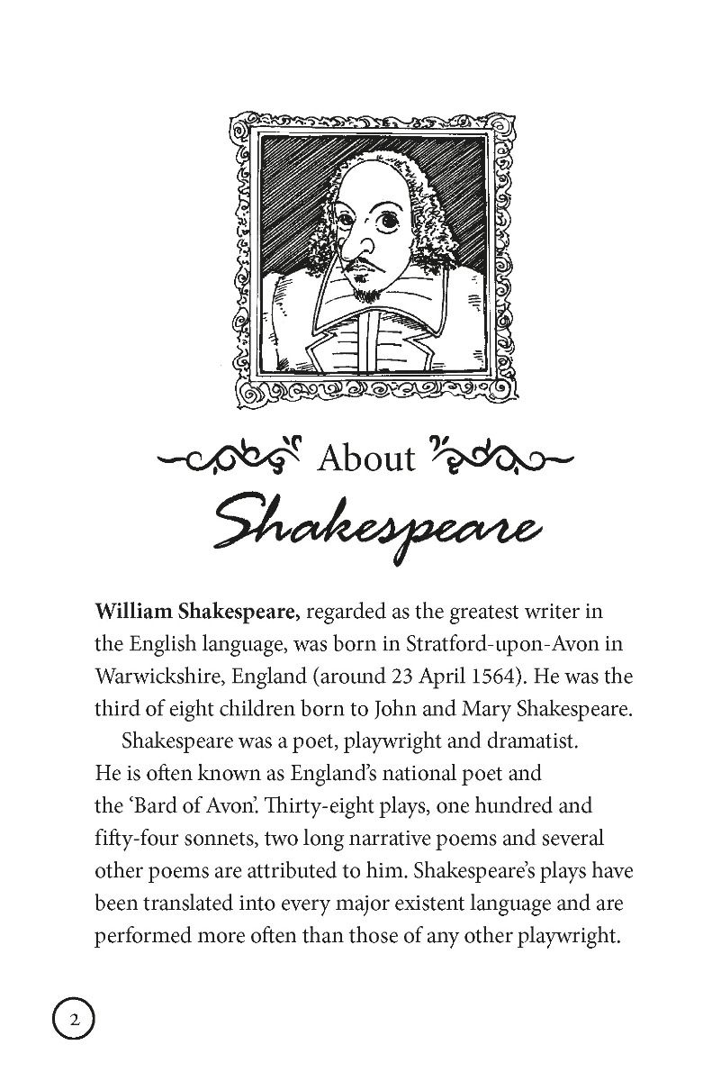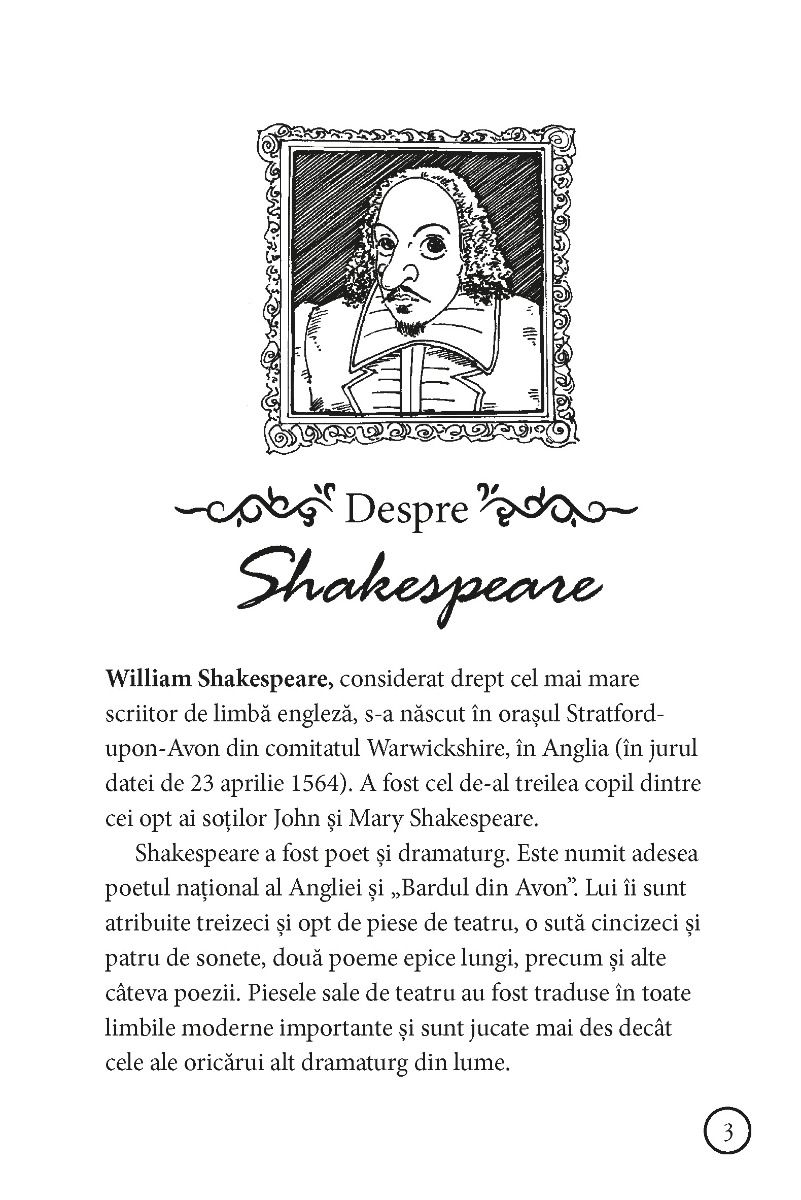 Această povestire pe scurt a piesei este special adaptată pentru a veni în sprijinul tinerilor cititori care doresc să pătrundă în lumea personajelor lui Shakespeare. Copiii pot citi povestirea singuri sau cu ajutorul părinţilor. De asemenea, profesorii o pot folosi ca material didactic la şcoală. Naraţiunea uşor de înţeles şi ilustraţiile în stilul benzilor desenate vor stârni, cu siguranţă, interesul copiilor şi le vor dezvolta pasiunea pentru lectură.