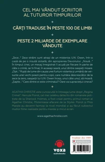 AGATHA CHRISTIE este cunoscută în întreaga lume drept „Regina Crimei“. Hercule Poirot, cel mai celebru detectiv din romanele polițiste de la Sherlock Holmes, a fost creat pentru primul roman al Agathei Christie, Misterioasa afacere de la Styles. Poirot și Miss Marple au devenit faimoși la nivel mondial și au făcut subiectul multor filme realizate pentru marele și micul ecran.