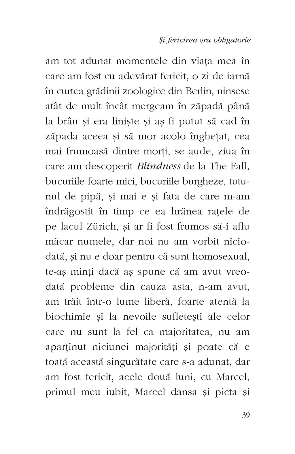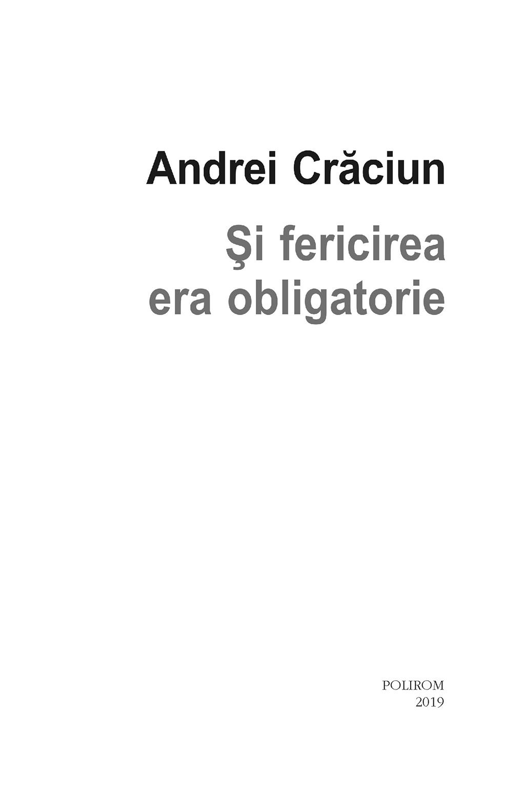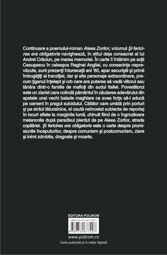 Continuare a poemului-roman Aleea Zorilor, volumul Și fericirea era obligatorie navighează, în stilul deja consacrat al lui Andrei Crăciun, pe marea memoriei. În carte îi întîlnim pe soții Ceaușescu în caleașca Reginei Angliei, cu consecințe neprevăzute, sînt prezenți întunecații ani ’80, apar securiștii și primii îmbogățiți ai tranziției, dar și alte personaje extraordinare, precum țiganul înțelept și orb care are puterea să vadă viitorul sau tînăra dintr-o familie de mafioți din sudul Italiei. Povestitorul este un ziarist care colindă pămîntul în căutarea adevărului din spatele unei vechi balade maghiare ce avea forța să-i aducă pe oameni în pragul suicidului. Călător care umblă prin porturi și pe străzi lăturalnice, el caută neîncetat subiecte de reportaj în locuri aflate la marginile lumii, chinuit fiind de o îngrozitoare melancolie după paradisul pierdut de pe Aleea Zorilor, strada copilăriei. Și fericirea era obligatorie este o carte despre promisiunile începuturilor, despre comunism și postcomunism, ziare și inimi zdrobite, dragoste și moarte.