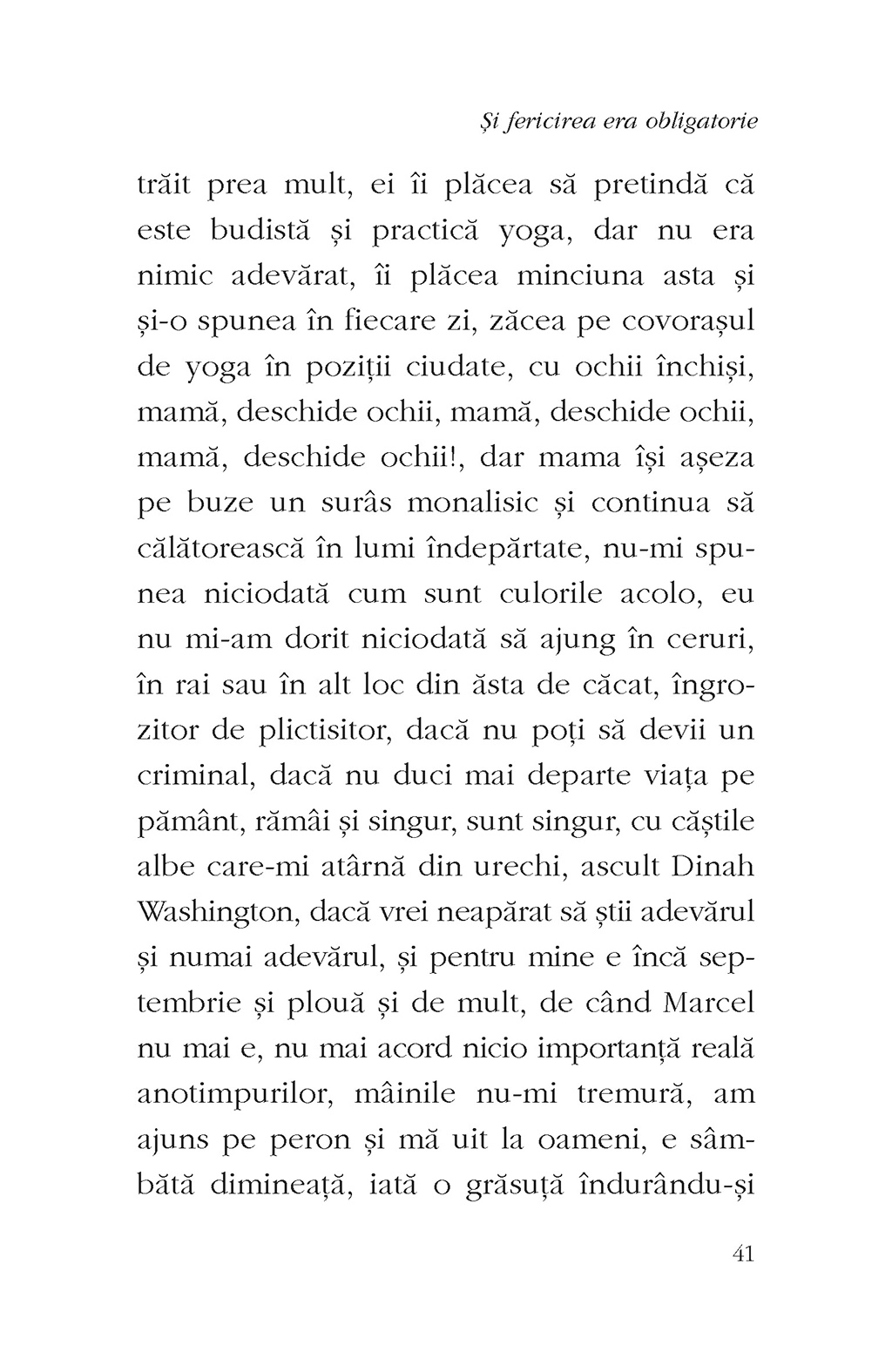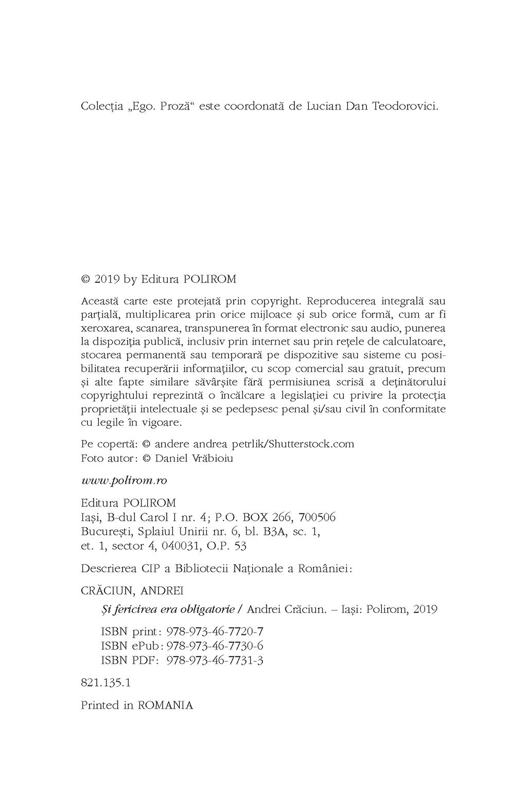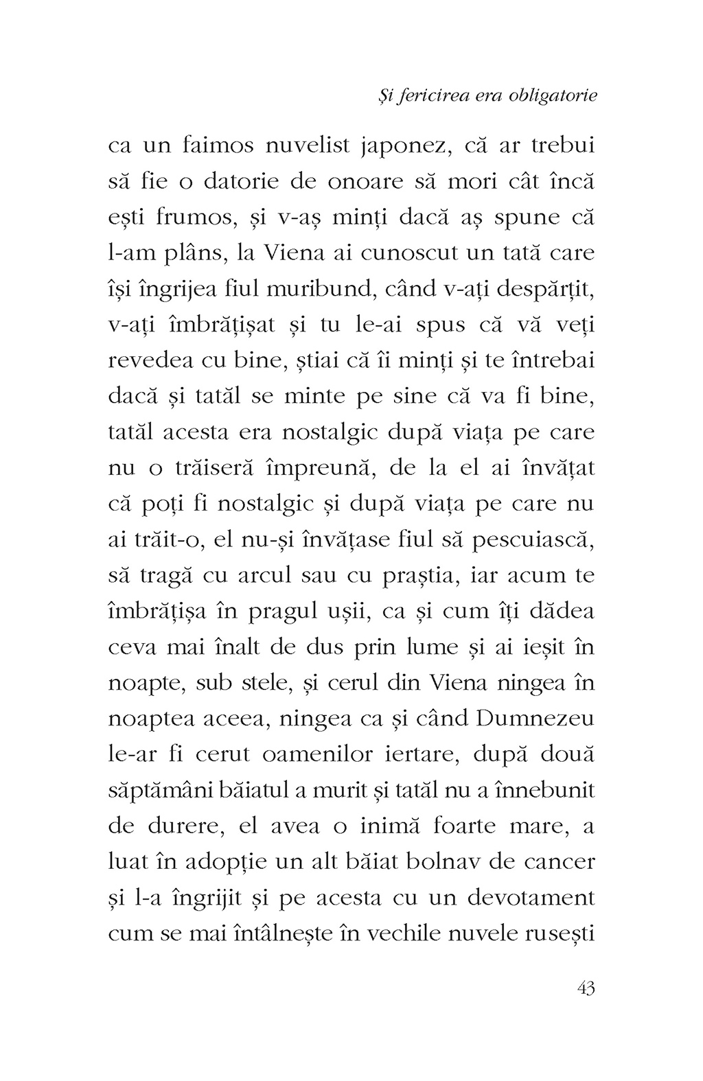 Continuare a poemului-roman Aleea Zorilor, volumul Și fericirea era obligatorie navighează, în stilul deja consacrat al lui Andrei Crăciun, pe marea memoriei. În carte îi întîlnim pe soții Ceaușescu în caleașca Reginei Angliei, cu consecințe neprevăzute, sînt prezenți întunecații ani ’80, apar securiștii și primii îmbogățiți ai tranziției, dar și alte personaje extraordinare, precum țiganul înțelept și orb care are puterea să vadă viitorul sau tînăra dintr-o familie de mafioți din sudul Italiei. Povestitorul este un ziarist care colindă pămîntul în căutarea adevărului din spatele unei vechi balade maghiare ce avea forța să-i aducă pe oameni în pragul suicidului. Călător care umblă prin porturi și pe străzi lăturalnice, el caută neîncetat subiecte de reportaj în locuri aflate la marginile lumii, chinuit fiind de o îngrozitoare melancolie după paradisul pierdut de pe Aleea Zorilor, strada copilăriei. Și fericirea era obligatorie este o carte despre promisiunile începuturilor, despre comunism și postcomunism, ziare și inimi zdrobite, dragoste și moarte.