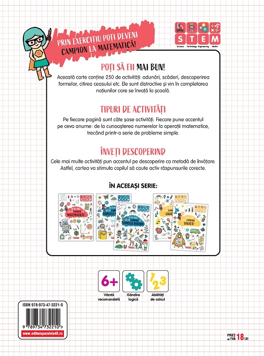 Această carte conține 250 de activități: adunări, scăderi, descoperirea formelor, citirea ceasului etc. Ele sunt distractive și vin în completarea noțiunilor care se învață la școală.