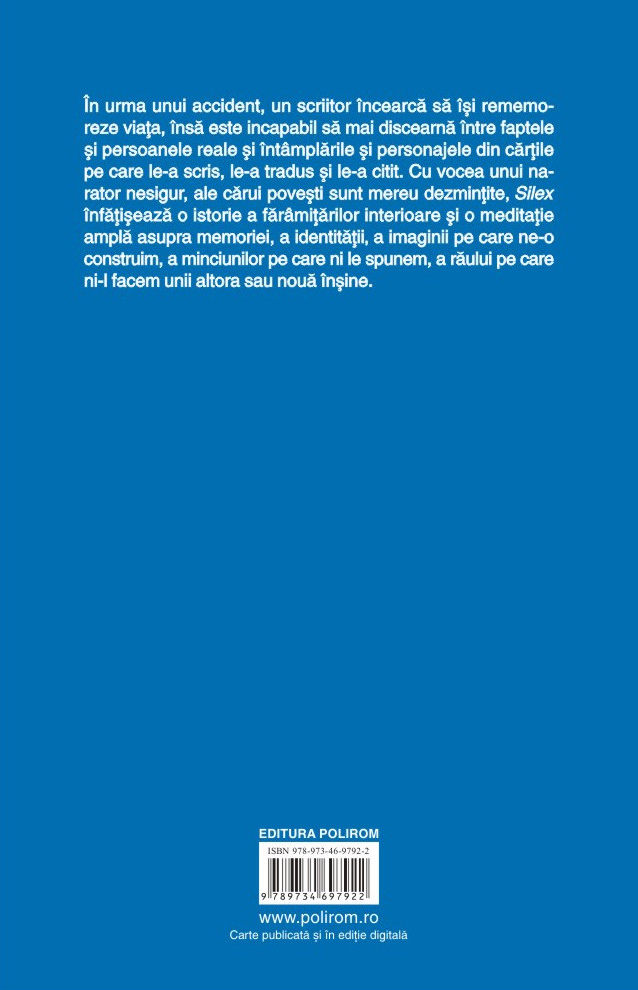 În urma unui accident, un scriitor încearcă să își rememoreze viața, însă este incapabil să mai discearnă între faptele și persoanele reale și întâmplările și personajele din cărțile pe care le-a scris, le-a tradus și le-a citit. Cu vocea unui narator nesigur, ale cărui povești sunt mereu dezmințite, Silex înfățișează o istorie a fărâmițărilor interioare și o meditație amplă asupra memoriei, a identității‚ a imaginii pe care ne-o construim, a minciunilor pe care ni le spunem, a răului pe care ni-l facem unii altora sau nouă înșine.