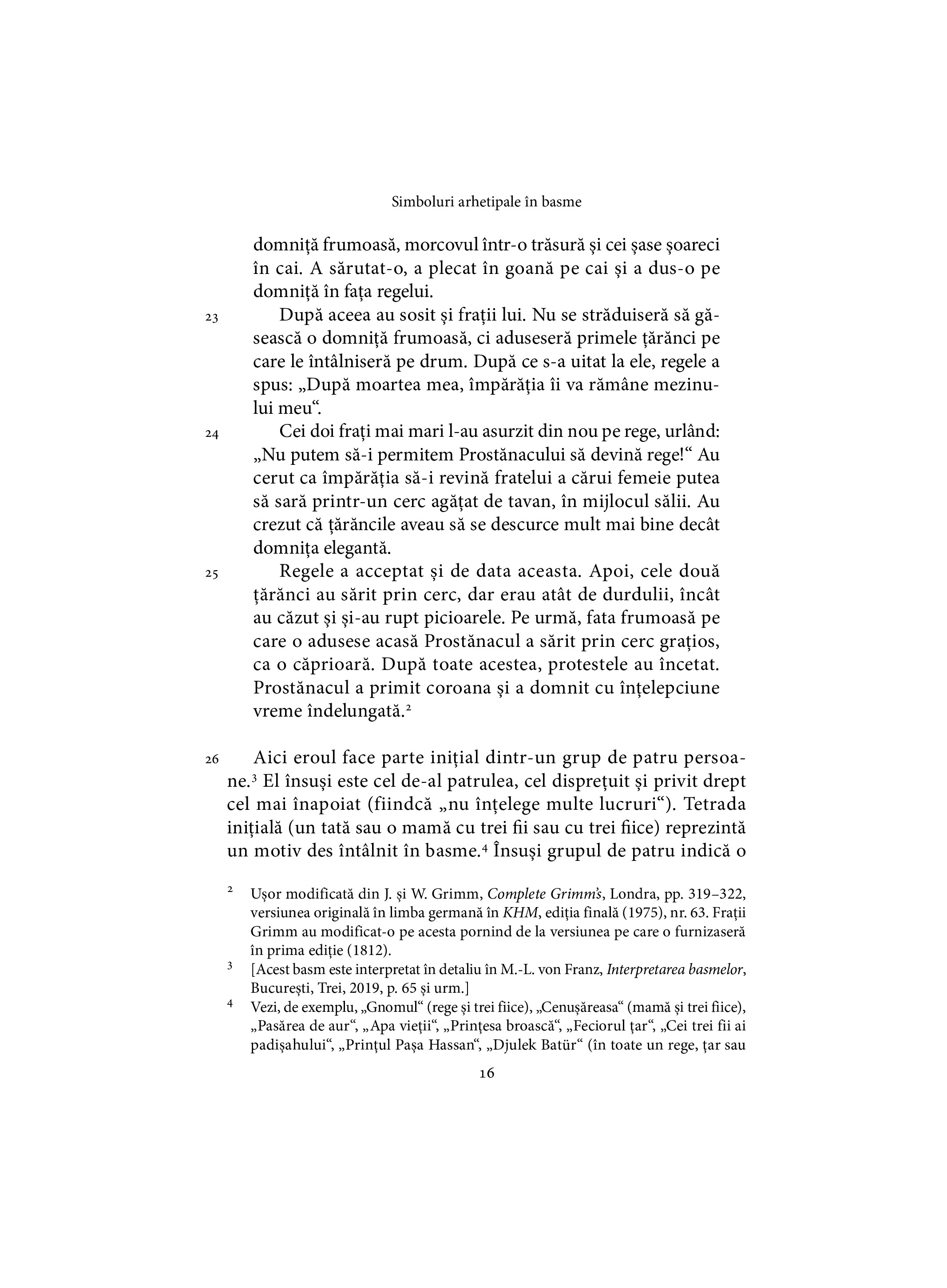 Prin analizarea unor basme din multe culturi ale lumii, Marie-Louise von Franz demonstrează că basmul își are rădăcinile și își extrage seva din inconștientul colectiv. Astfel, marea călătorie este o metaforă pentru intrarea temporară în inconștient,iar prada — comoara recuperată —simbolizează noile niveluri ale conștiinței care sunt smulse din inconștient. La rândul lor, rezistența pe care Marea Mamă o opune eroului și originilor sale umile, precum și eroul care eliberează anima din ghearele inconștientului se dovedesc a fi arhetipuri universale, prezente în creațiile tuturor popoarelor.
