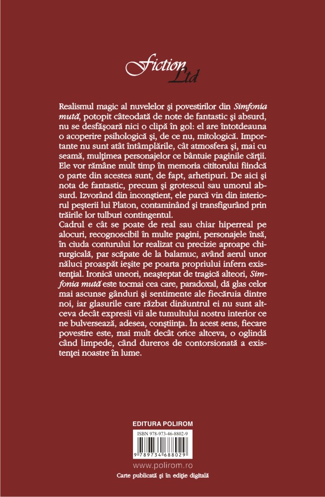 Cadrul e cât se poate de real sau chiar hiperreal pe alocuri, recognoscibil în multe pagini, personajele însă, în ciuda conturului lor realizat cu precizie aproape chirurgicală, par scăpate de la balamuc, având aerul unor năluci proaspăt ieșite pe poarta propriului infern existențial. Ironică uneori, neașteptat de tragică alteori, Simfonia mută este tocmai cea care, paradoxal, dă glas celor mai ascunse gânduri și sentimente ale fiecăruia dintre noi, iar glasurile care răzbat dinăuntrul ei nu sunt altceva decât expresii vii ale tumultului nostru interior ce ne bulversează, adesea, conștiința. În acest sens, fiecare povestire este, mai mult decât orice altceva, o oglindă când limpede, când dureros de contorsionată a existenței noastre în lume.