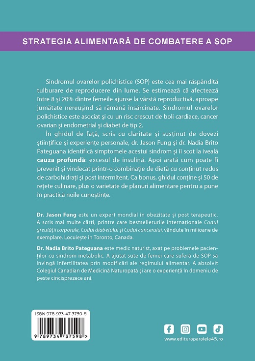 În ghidul de față, scris cu claritate și susținut de dovezi științifice și experiențe personale, dr. Jason Fung și dr. Nadia Brito Pateguana identifică simptomele acestui sindrom și îi scot la iveală cauza profundă: excesul de insulină. Apoi arată cum poate fi prevenit și vindecat printr-o combinație de dietă cu conținut redus de carbohidrați și post intermitent. Ca bonus, ghidul conține și 50 de rețete culinare, plus o varietate de planuri alimentare pentru a pune în practică noile cunoștințe.