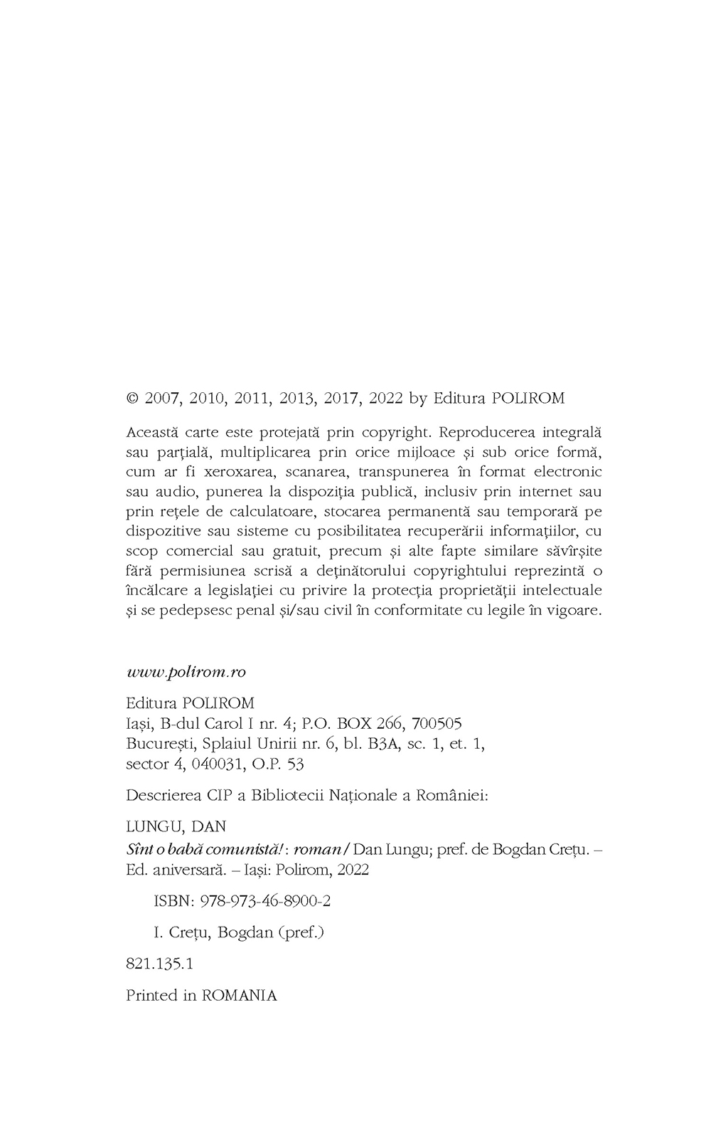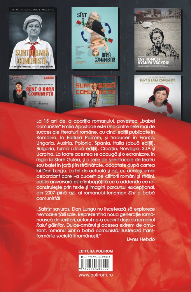 La 15 ani de la apariţia romanului, povestea „babei comuniste” Emilia Apostoae este una dintre cele mai de succes ale literaturii române, cu cinci ediţii publicate în România, la Editura Polirom, şi traduceri în Franţa, Ungaria, Austria, Polonia, Spania, Italia (două ediţii), Bulgaria, Turcia (două ediţii), Croaţia, Norvegia, SUA şi Ucraina. La toate acestea se adaugă şi o ecranizare, în regia lui Stere Gulea, şi o serie de spectacole de teatru sau balet în ţară şi în străinătate, adaptate după cartea lui Dan Lungu. La fel de actuală şi azi, cu acelaşi umor debordant care i-a cucerit pe cititorii români şi străini, ediţia aniversară este îmbogăţită cu o addenda ce reconstruieşte prin texte şi imagini parcursul excepţional, din 2007 până azi, al romanului-fenomen Sînt o babă comunistă!