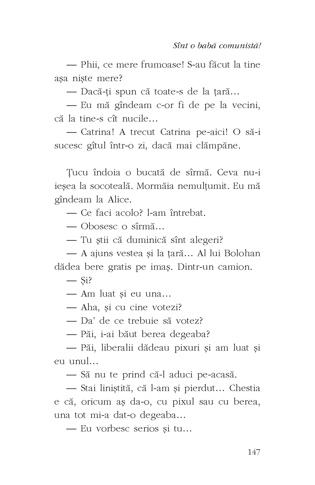 „Satirist savuros, Dan Lungu nu încetează să exploreze nevrozele ţării sale. Reprezentând noua generaţie românească de scriitori, autorul ne-a cucerit deja cu romanul Raiul găinilor. Dulce-amărui şi adesea extrem de amuzant, romanul Sînt o babă comunistă! ilustrează transformările societăţii româneşti.” (Livres Hebdo)