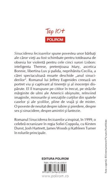 Sinuciderea fecioarelor spune povestea unor barbati ale caror vieti au fost schimbate pentru totdeauna de obsesia lor violenta pentru cele cinci surori Lisbon: inteligenta Therese, pretentioasa Mary, ascetica Bonnie, libertina Lux si palida, neprihanita Cecilia, a carei spectaculoasa moarte deschide „anul sinuci-derilor”. Romanul lui Jeffrey Eugenides creeaza un portret viu si captivant al tineretii si al inocentei disparute. El il transpune pe cititor in trecut, pe strazile marginite de ulmi ale Americii obisnuite, reinviind imaginile, mirosurile si senzatiile curtilor din spatele caselor si ale scolilor, pline de vraja si de mister.