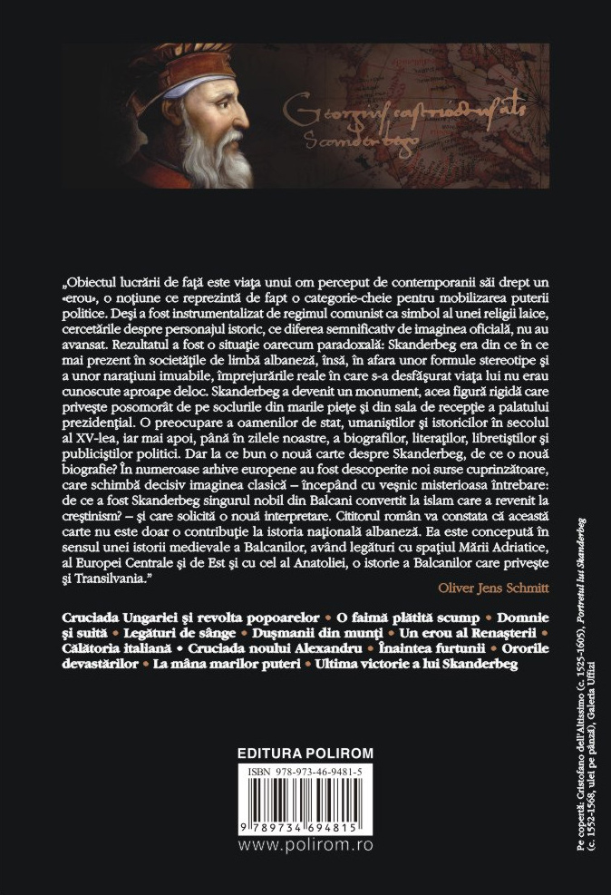 „Obiectul lucrării de față este viața unui om perceput de contemporanii săi drept un «erou», o noțiune ce reprezintă de fapt o categorie‑cheie pentru mobilizarea puterii politice. Deși a fost instrumentalizat de regimul comunist ca simbol al unei religii laice, cercetările despre personajul istoric, ce diferea semnificativ de imaginea oficială, nu au avansat. Rezultatul a fost o situație oarecum paradoxală: Skanderbeg era din ce în ce mai prezent în societățile de limbă albaneză, însă, în afara unor formule stereotipe și a unor narațiuni imuabile, împrejurările reale în care s‑a desfășurat viața lui nu erau cunoscute aproape deloc. Skanderbeg a devenit un monument, acea figură rigidă care privește posomorât de pe soclurile din marile piețe și din sala de recepție a palatului prezidențial. O preocupare a oamenilor de stat, umaniștilor și istoricilor în secolul al XV‑lea, iar mai apoi, până în zilele noastre, a biografilor, literaților, libretiștilor și publiciștilor politici. Dar la ce bun o nouă carte despre Skanderbeg, de ce o nouă biografie? În numeroase arhive europene au fost descoperite noi surse cuprinzătoare, care schimbă decisiv imaginea clasică – începând cu veșnic misterioasa întrebare: de ce a fost Skanderbeg singurul nobil din Balcani convertit la islam care a revenit la creștinism? – și care solicită o nouă interpretare. Cititorul român va constata că această carte nu este doar o contribuție la istoria națională albaneză. Ea este concepută în sensul unei istorii medievale a Balcanilor, având legături cu spațiul Mării Adriatice, al Europei Centrale și de Est și cu cel al Anatoliei, o istorie a Balcanilor care privește și Transilvania.” (Oliver Jens Schmitt)