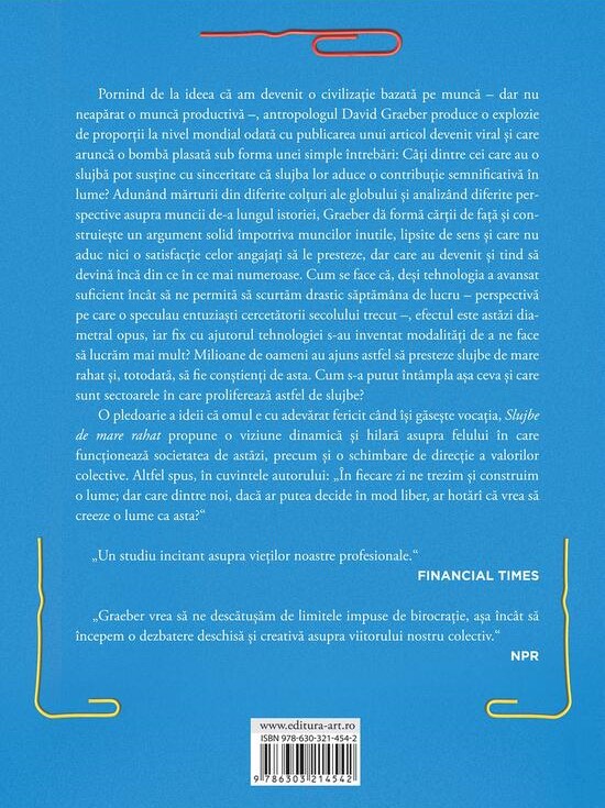 Cum se face că, deși tehnologia a avansat suficient încât să ne permită să scurtăm drastic săptămâna de lucru - perspectivă pe care o speculau entuziaști cercetătorii secolului trecut -, efectul este astăzi diametral opus, iar fix cu ajutorul tehnologiei s-au inventat modalități de a ne face să lucrăm mai mult? Milioane de oameni au ajuns să presteze astfel slujbe de mare rahat și, totodată, să fie conștienți de asta. Cum s-a putut întâmpla așa ceva și care sunt sectoarele care proliferează astfel de slujbe?