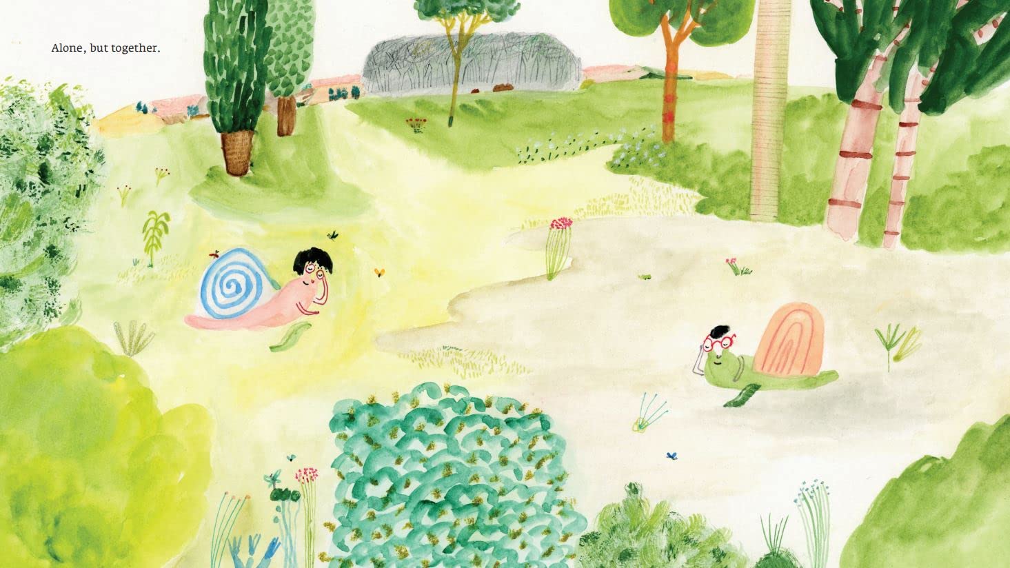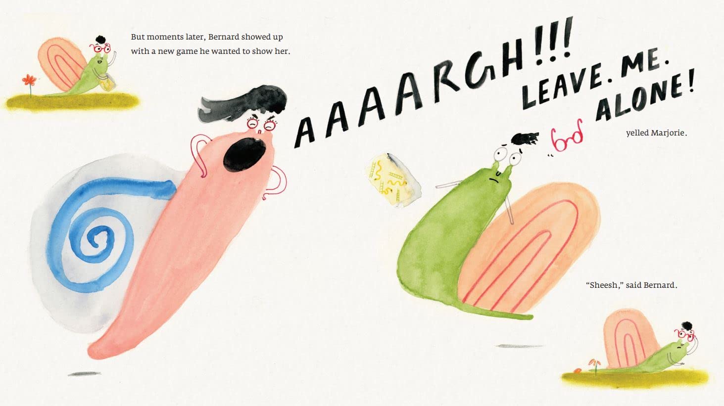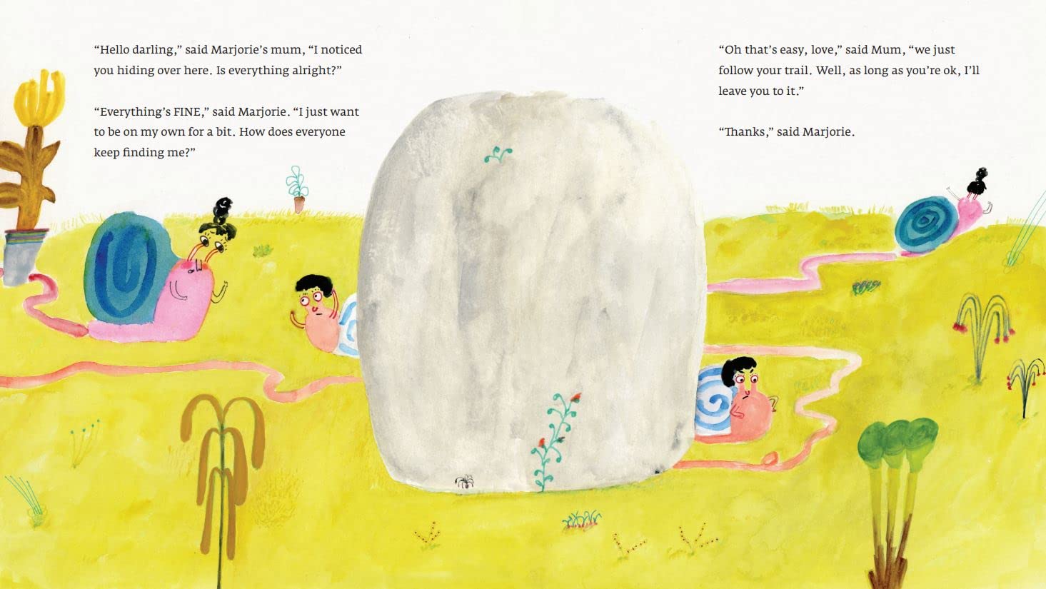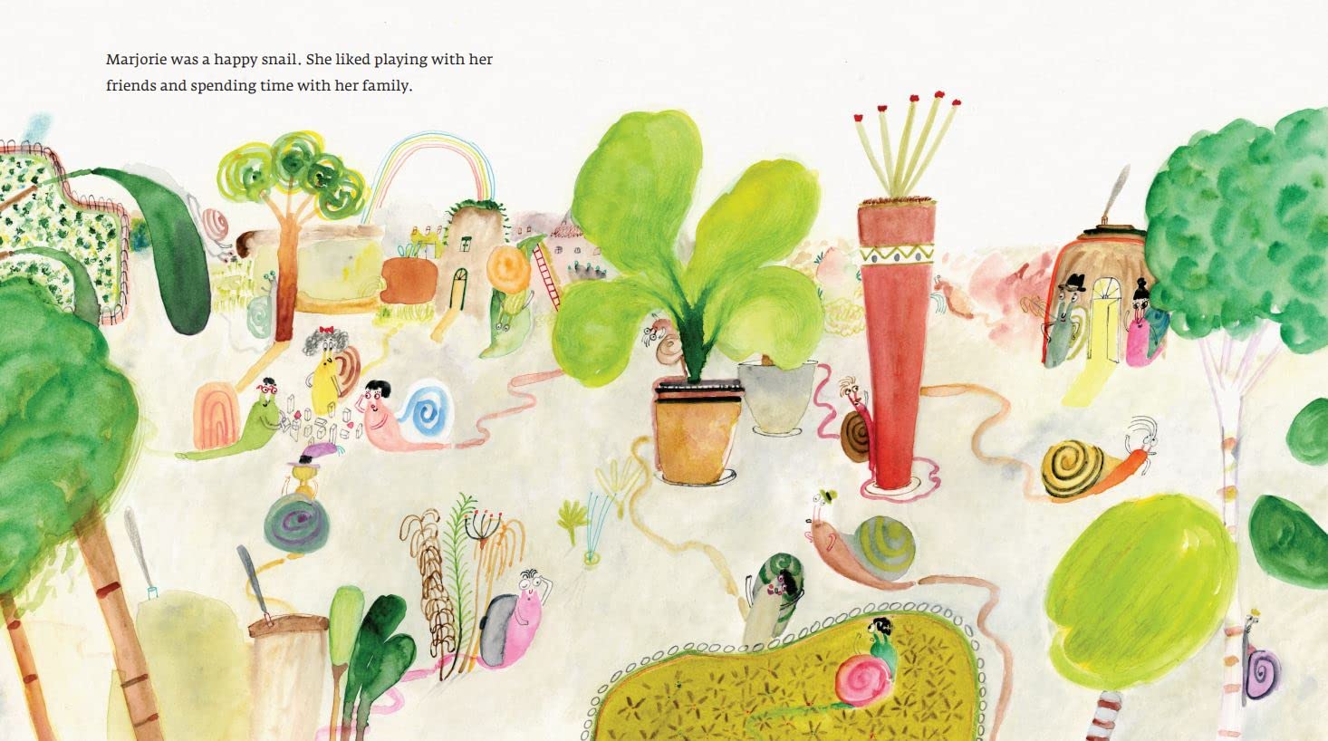 Marjorie is a happy snail. She loves her family and friends, but sometimes she just needs a bit of alone time. At these moments, Marjorie wanders off to try to find a quiet space, but her friends and family just follow her trail of slime and find her.