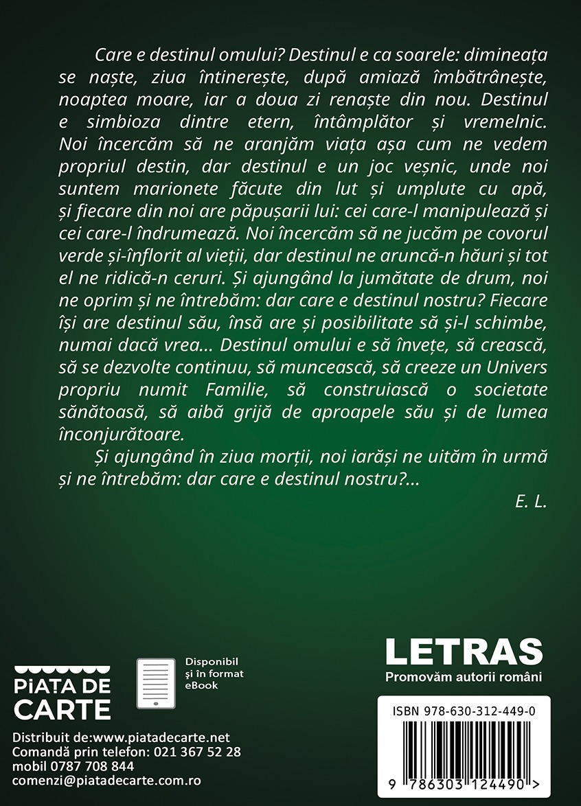 Fiecare isi are destinul sau, insa are si posibilitatea sa si-l schimbe, numai daca vrea… Destinul omului e sa invete, sa creasca, sa se dezvolte continuu, sa munceasca, sa creeze un Univers propriu numit Familie, sa construiasca o societate sanatoasa, sa aiba grija de aproapele sau si de lumea inconjuratoare.