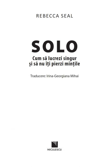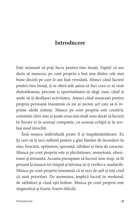 În această carte, Rebecca Seal aduce în discuție ceea ce avem de câștigat, dar și ceea ce ratăm atunci când trecem de la un me¬diu de lucru specific unui birou dintr-o companie, la izolarea și singurătatea din casele noastre. Autoarea îmbină informațiile preluate din cele mai recente studii de psihologie, economie și științe sociale cu datele personale, obținute în urma a zeci de ani de experiență ca freelancer, arătându-ne cum să ne păstrăm reziliența, productivitatea și concentrarea într-o firmă care cel mai adesea are un singur angajat.