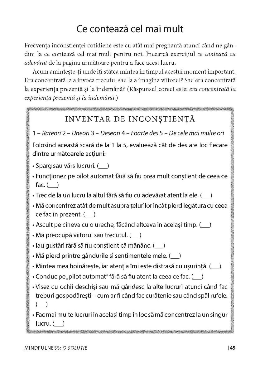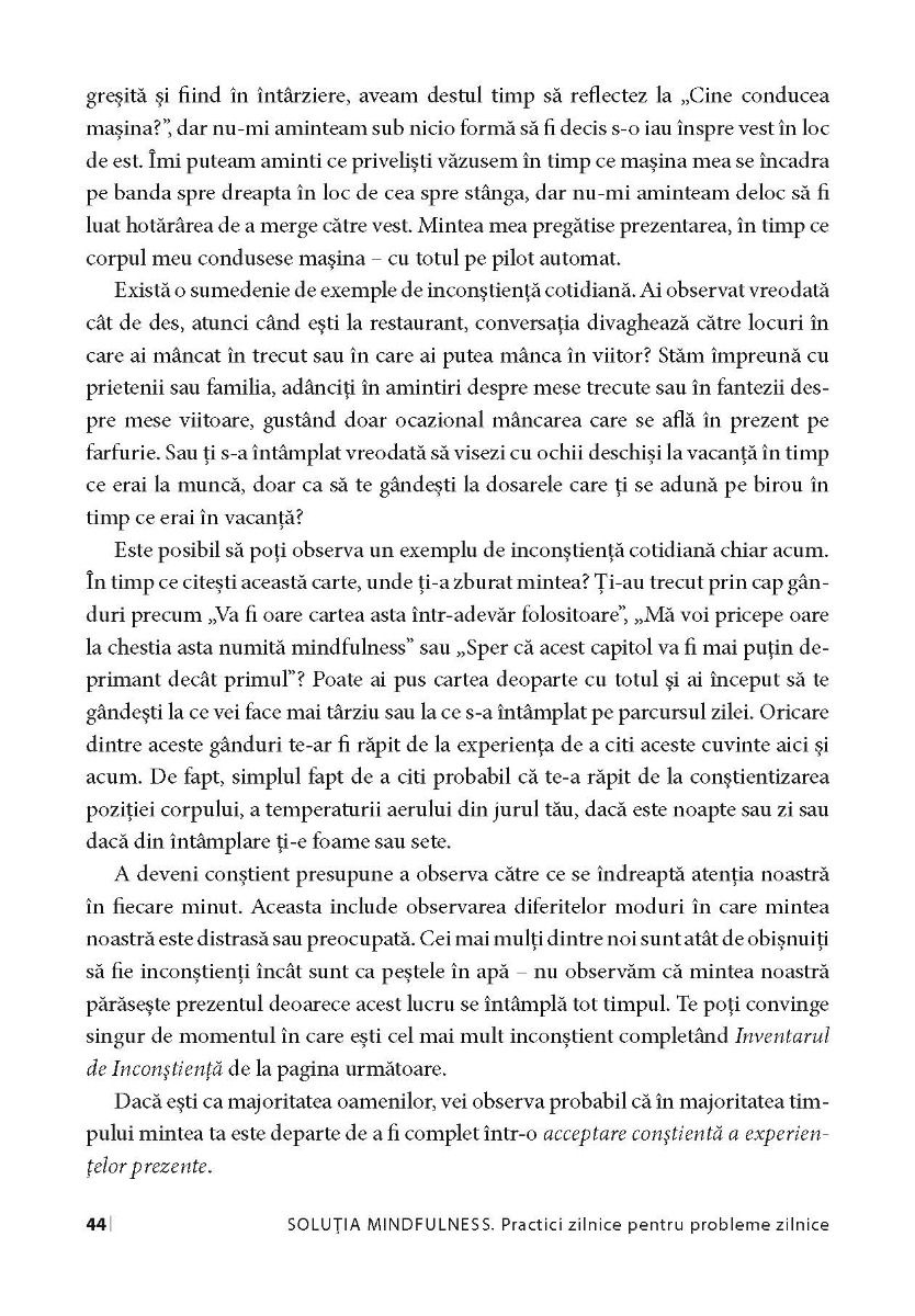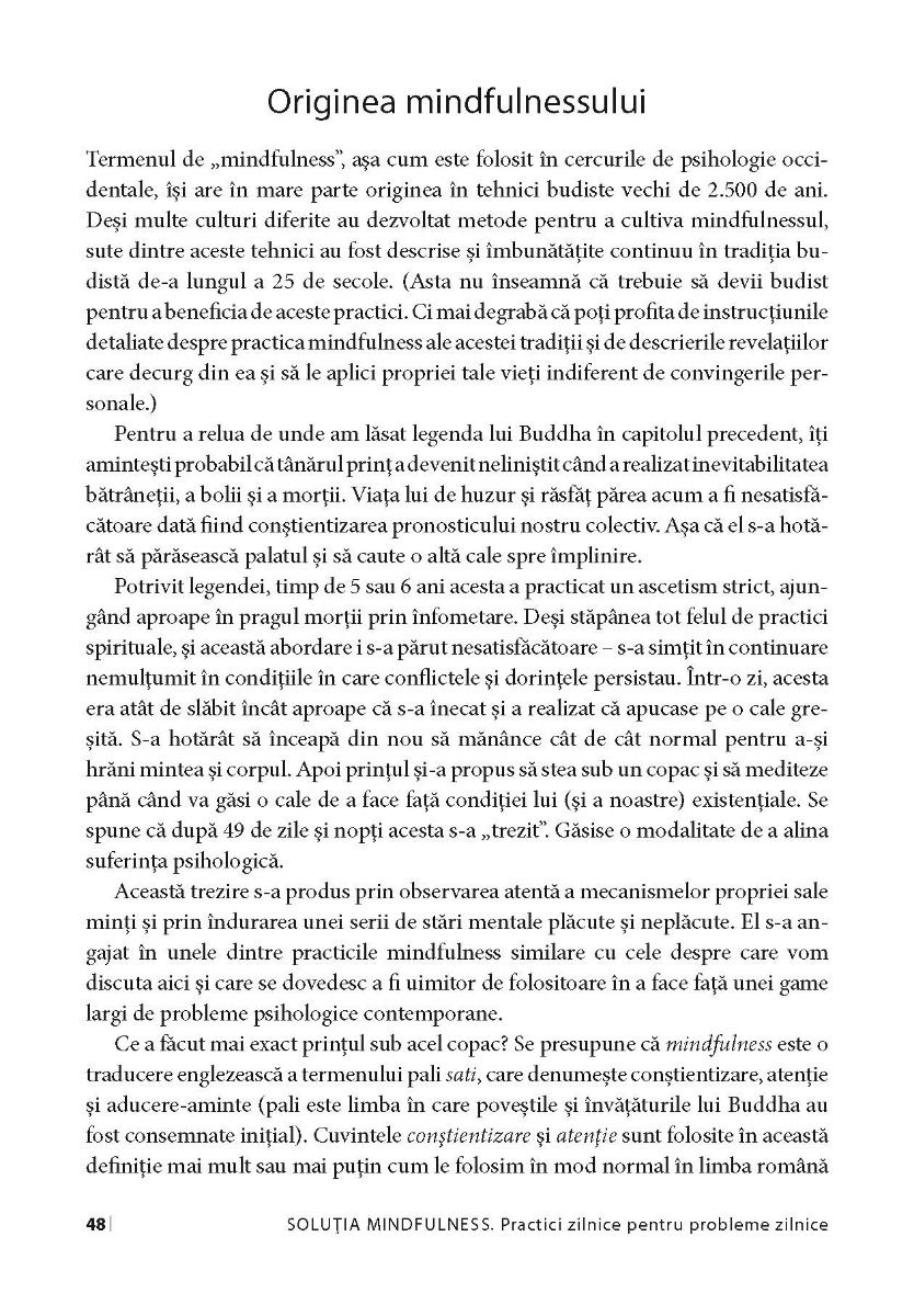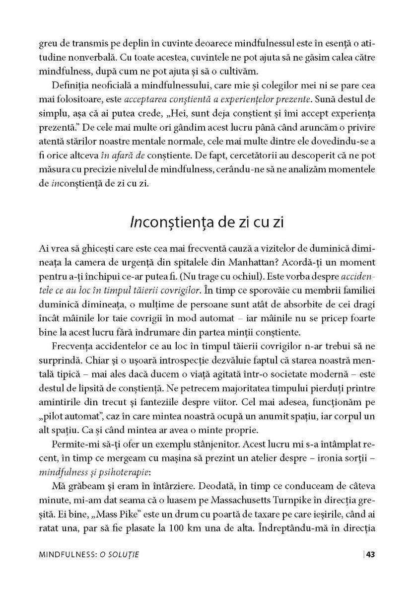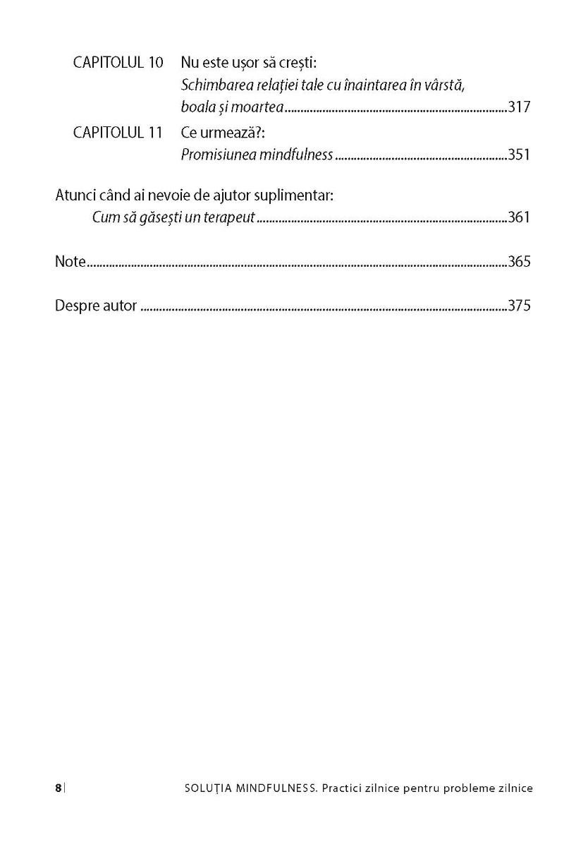 Mindfulnessul oferă o cale către bunăstare și instrumentele necesare pentru a face față obstacolelor inevitabile ale vieții. Și, deși această practică îți poate părea exotică, o poți cultiva – și poți culege beneficiile ei dovedite – fără antrenament special și fără a necesita mult timp liber. În acest ghid accesibil, terapeutul și expertul în mindfulness Dr. Ronald Siegel îți arată exact cum să faci acest lucru. Aici vei găsi strategii eficiente pe care le poți folosi în timp ce conduci către serviciu, în timp ce plimbi câinele sau îți speli vasele, plus sfaturi pentru a-ți putea crea o rutină de practică formală în doar 20 de minute pe zi.